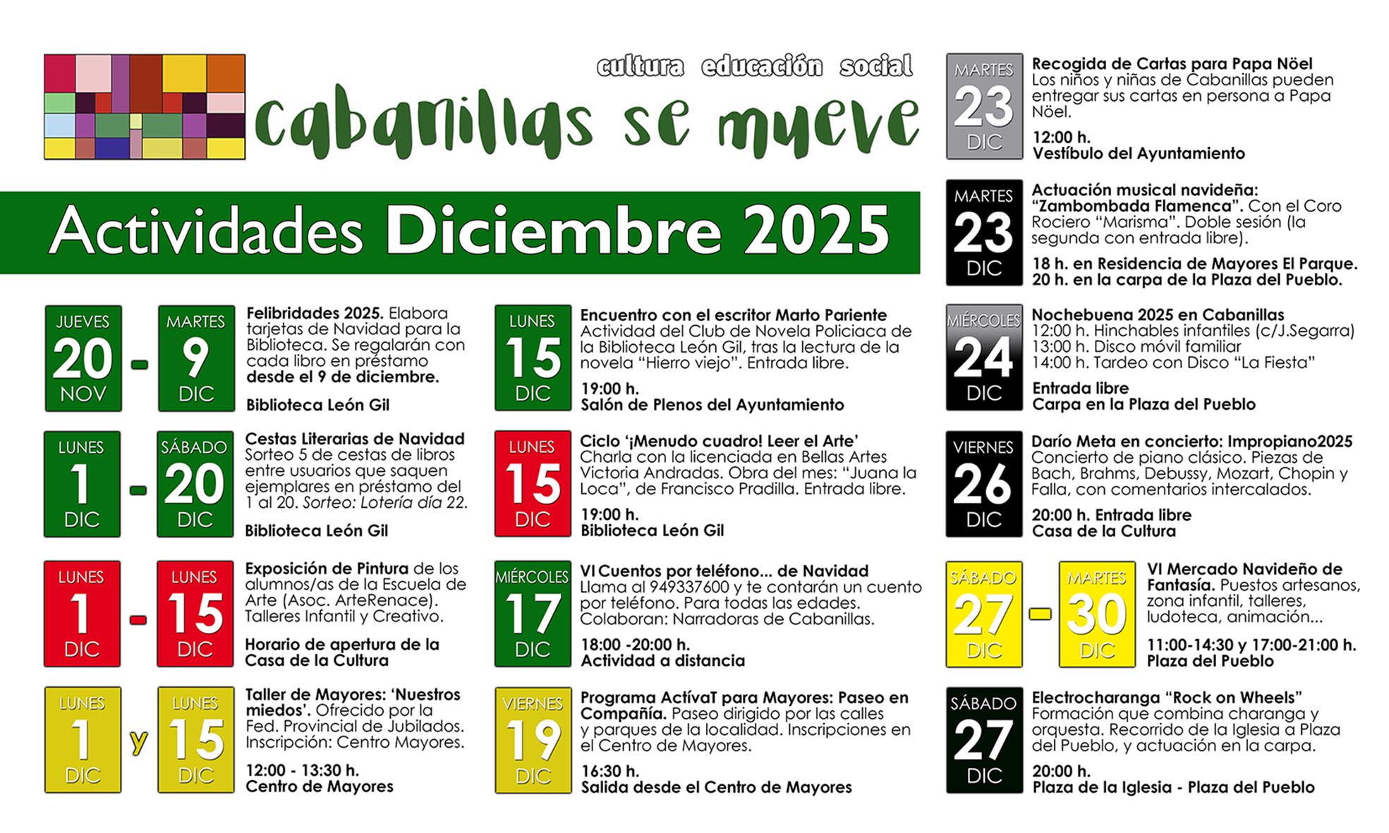 Disponible para consulta y descarga el cartel mensual de actividades socioculturales "Cabanillas se mueve" de diciembre de 2025