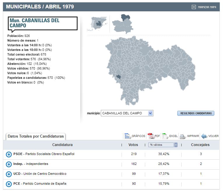 A aquellas primeras Elecciones Municipales democráticas de 1979 concurrieron cuatro candidaturas en Cabanillas, con tres partidos de ámbito estatal (PSOE y PCE en la izquierda; y los centristas de la desaparecida UCD de Adolfo Suárez), y una lista independiente de la derecha local. Entonces el censo de la localidad era de solo 678 electores, de los que votaron 576 (un altísimo 85% de participación). La lista socialista ganó con el 38’4% de los votos, seguida de los independientes (28’4%); UCD con el 17’4%, y el PCE, que sacó el 15’8% de los sufragios. Se repartían entonces sólo 7 concejales, de los que el PSOE se llevó 3, los independientes 2; y UCD y PCE, uno cada uno.