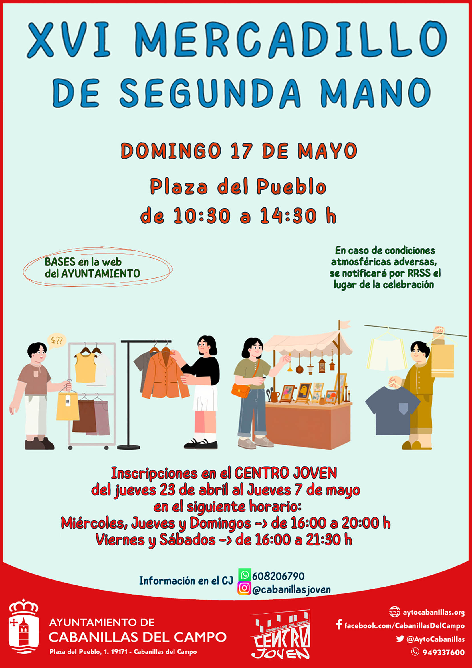 El próximo domingo 17 de mayo se celebrará la 16ª edición del Mercadillo de Segunda Mano de Cabanillas del Campo, una cita que viene organizando el Ayuntamiento dos veces al año, en primavera y en otoño, desde su nacimiento en el otoño de 2016, hace casi una década. El Mercadillo se instalará (si el tiempo lo permite) en la Plaza del Pueblo, y abrirá sus puertas al público de 10:30 a 14:30 h. En caso de lluvia la organización podría desplazar su celebración a un recinto a cubierto, del que se informaría convenientemente en los días previos.