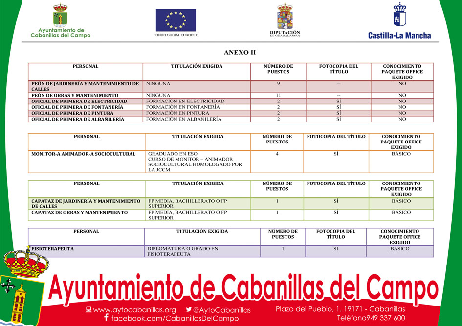 En esta ocasión se trata (con la excepción del citado contrato de fisioterapeuta) de puestos de trabajo de un perfil menos técnico que los de la fase anterior, y por tanto requieren, en general, titulaciones menos exigentes. Así, con este proceso se espera contratar a 9 peones de jardinería y mantenimiento de calles, 11 peones de obras y mantenimiento, 2 oficiales de primera de electricidad, 2 oficiales de primera de fontanería, 2 oficiales de primera de pintura y 2 oficiales de primera de albañilería, así como 2 capataces: uno para jardinería y mantenimiento de calles, y otro para obras y mantenimiento. También se buscan, por otro lado, 4 monitores-animadores socioculturales, y el citado puesto de fisioterapeuta que quedó vacante en el proceso anterior.