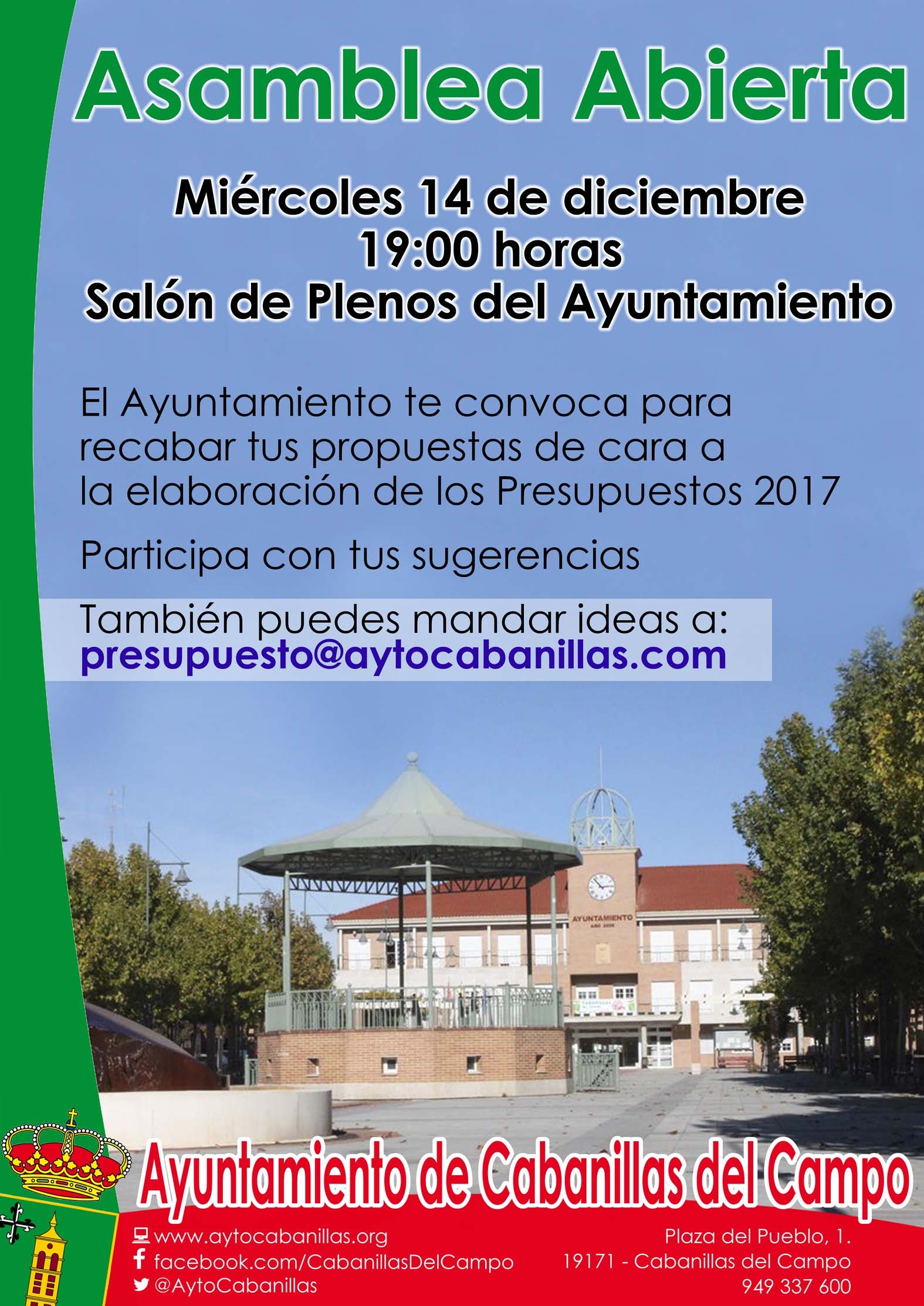 La Asamblea Abierta se celebrará el miércoles 14 de diciembre a las 19 horas en el Salón de Plenos del Ayuntamiento Además, se ha habilitado una dirección de correo electrónico donde los ciudadanos pueden mandar sus sugerencias