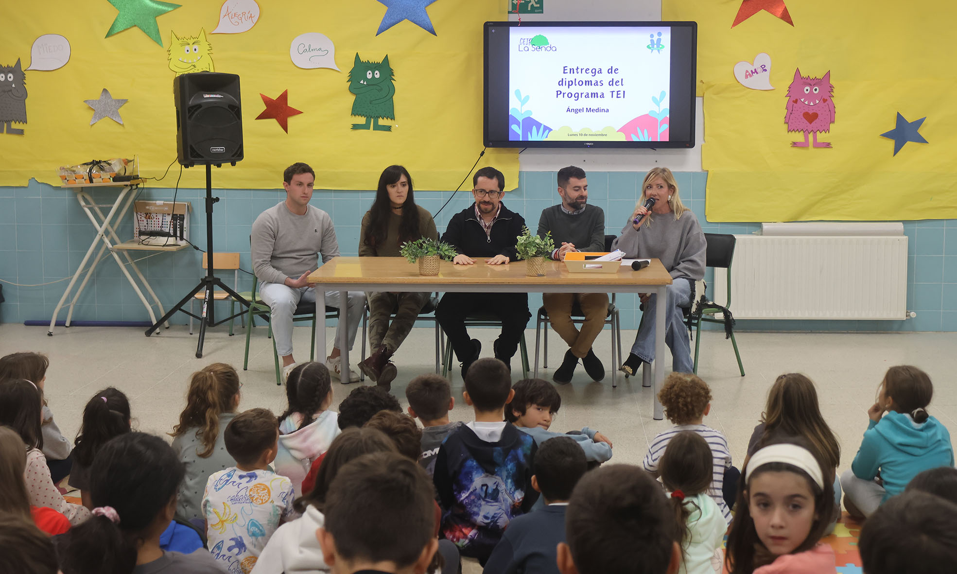 Por su parte, Ángel Medina se prestó a una enorme batería de preguntas sobre su vida y su trabajo como actor que le realizaron los niños y niñas de La Senda, antes de que todos ellos fueran recogiendo sus diplomas «TEI». La presencia del actor alborotó la mañana escolar del colegio cabanillero, entusiasmando a los chicos y chicas del centro.