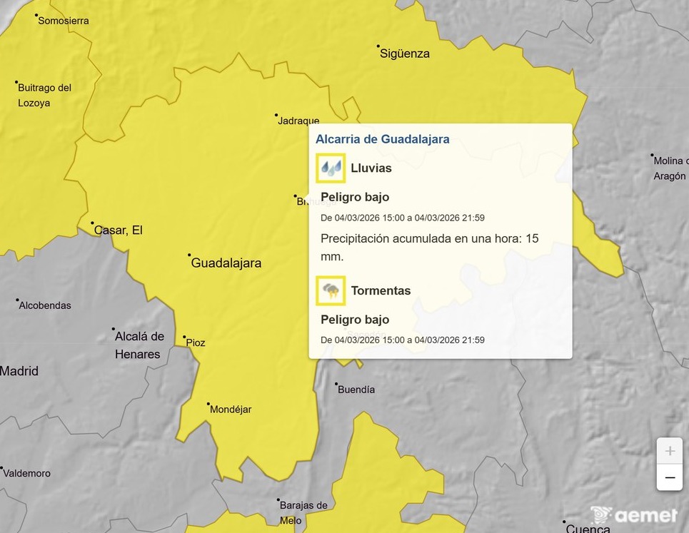 La Agencia Estatal de Meteorología ha decretado un aviso de nivel amarillo (peligro bajo) para la jornada de este miércoles 4 de marzo de 2026, por riesgo de lluvias y tormentas intensas, que podrían venir acompañadas de granizo.