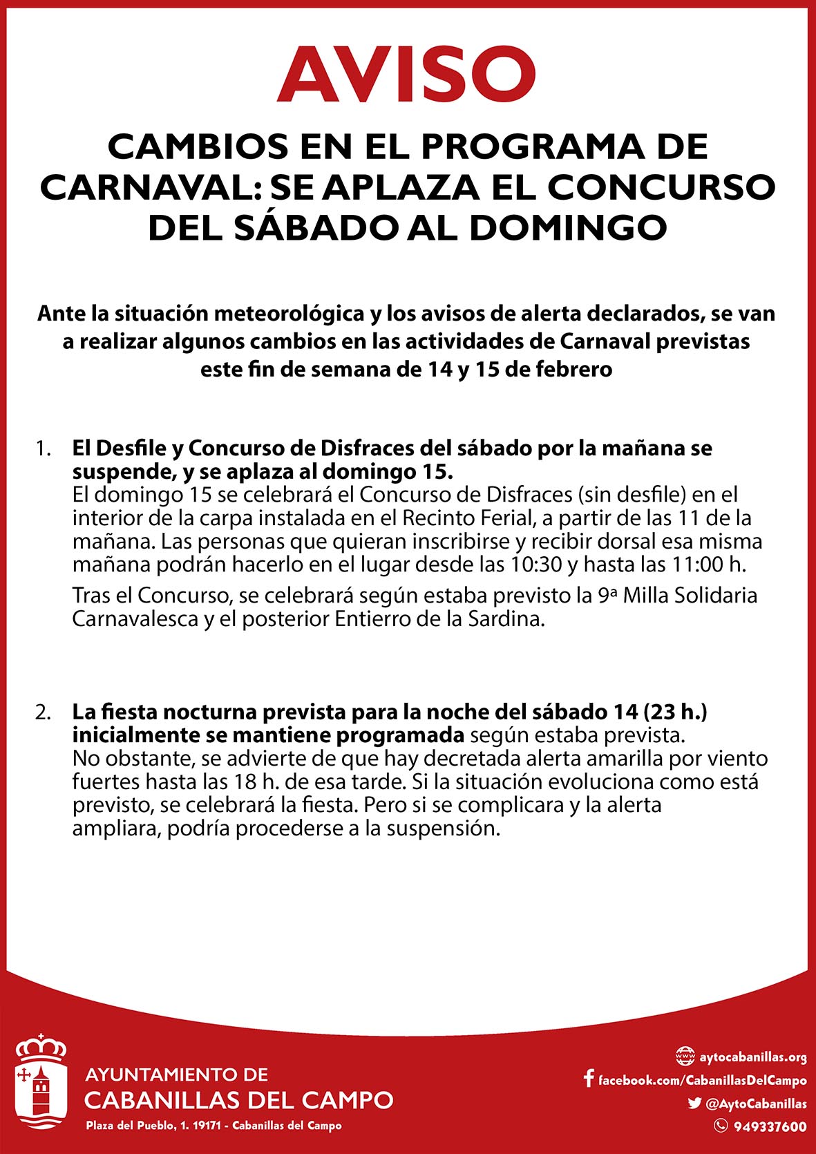 Ante la situación meteorológica y los avisos de alerta declarados, se van a realizar algunos cambios en las actividades de Carnaval previstaseste fin de semana de 14 y 15 de febrero.