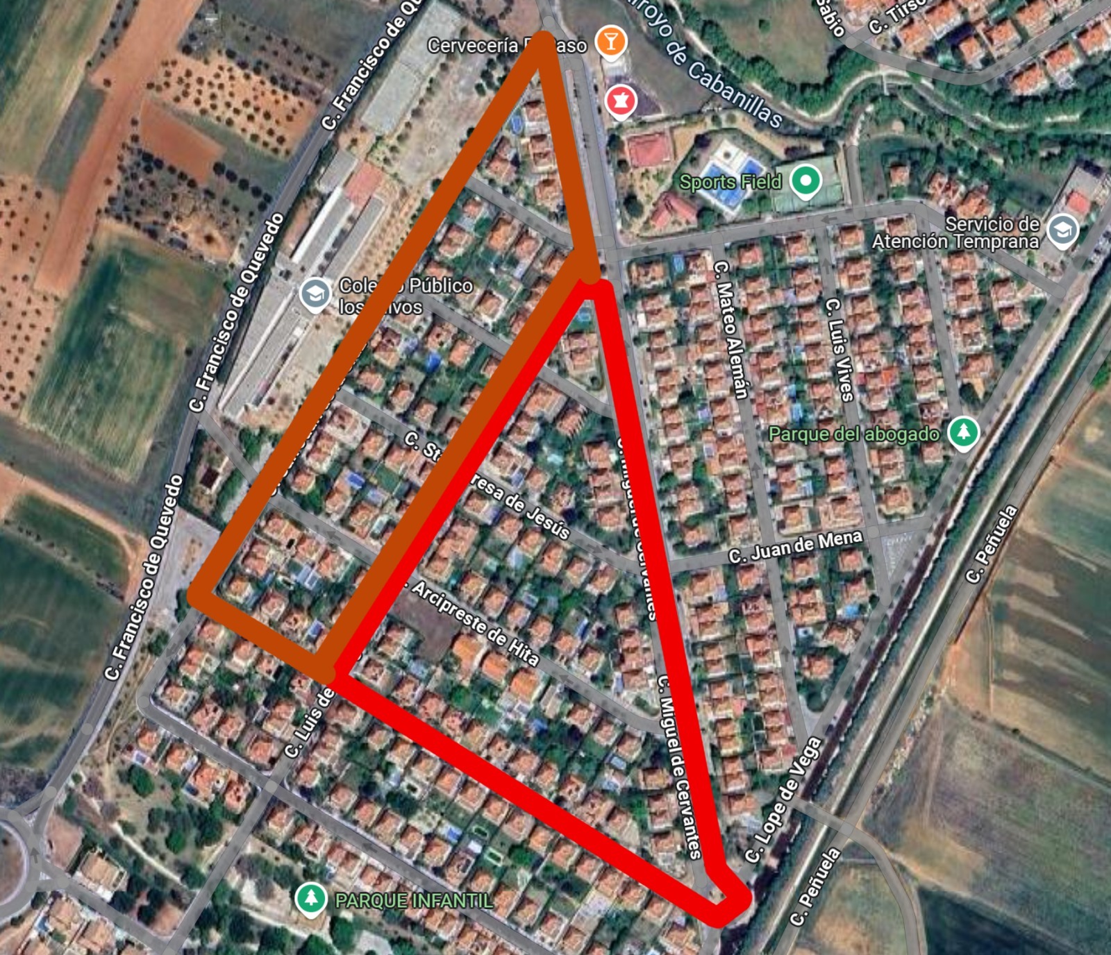 El corte afectará con seguridad al triángulo comprendido por las calle Miguel de Cervantes, Gonzalo de Berceo y Luis de Góngora (rojo), y probablemente también haya afecciones en el área delimitada por Gonzalo de Berceo, Luis de Góngora y San Juan de la Cruz (naranja).