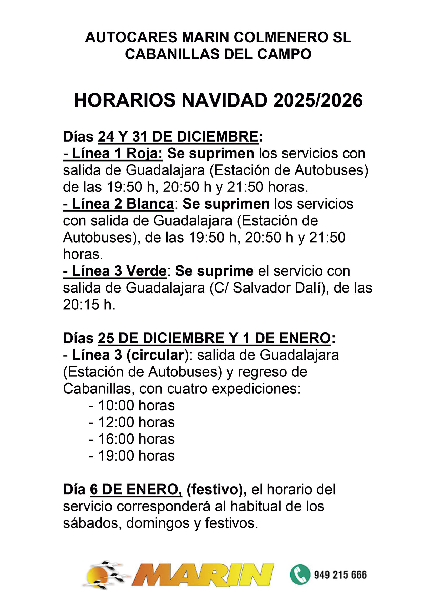 El servicio de autobús interurbano del Plan Astra entre Cabanillas del Campo y Guadalajara sufrirá algunas alteraciones horarias en los días de Nochebuena, Navidad, Nochevieja y Año Nuevo.