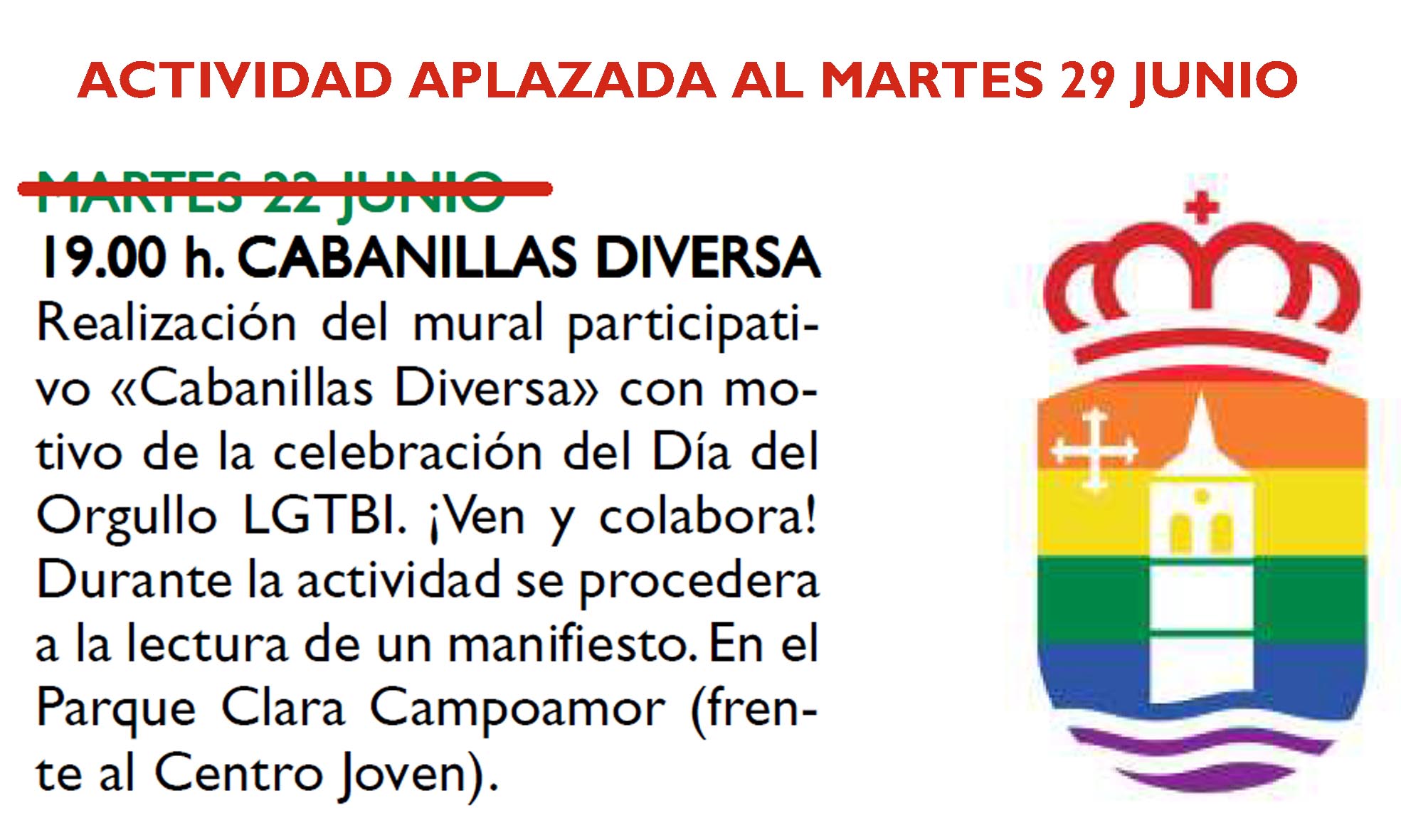 Debido a la previsión de lluvias para hoy, el acto «Cabanillas Diversa», de celebración del #Orgullo2021 en Cabanillas del Campo, previsto inicialmente para este martes 22 de junio a las 19 horas, se aplaza una semana, hasta el martes 29, a la misma hora.