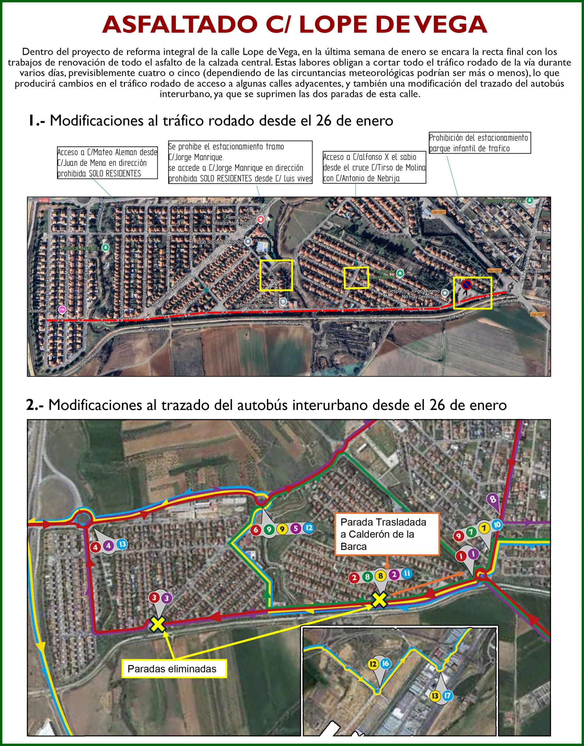En cuanto al autobús interurbano, debido a los trabajos de asfaltado se suprimirán desde el lunes 26 y hasta nuevo aviso las dos paradas de la calle Lope de Vega. De este modo, el autobús accederá al Mirador por la calle Calderón de la Barca, para salir a la calle Francisco de Quevedo. La parada del cruce de Lope de Vega con Tirso de Molina se traslada al inicio de la calle (al cruce con Calderón de la Barca). Mientras que la parada del cruce entre Lope de Vega y Miguel de Cervantes se suprime, y como alternativa podrán usar las paradas de autobús de la calle Francisco de Quevedo.