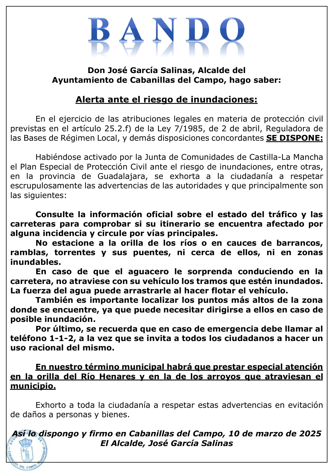 Ante la situación de emergencia por riesgo de inundaciones que hay declarada en estos días en toda la comarca, con la activación del Plan Especial de Protección Civil por parte de la administración regional, el alcalde de Cabanillas del Campo, José García Salinas, ha emitido un Bando de Alcaldía alertando de la situación y con algunas recomendaciones.