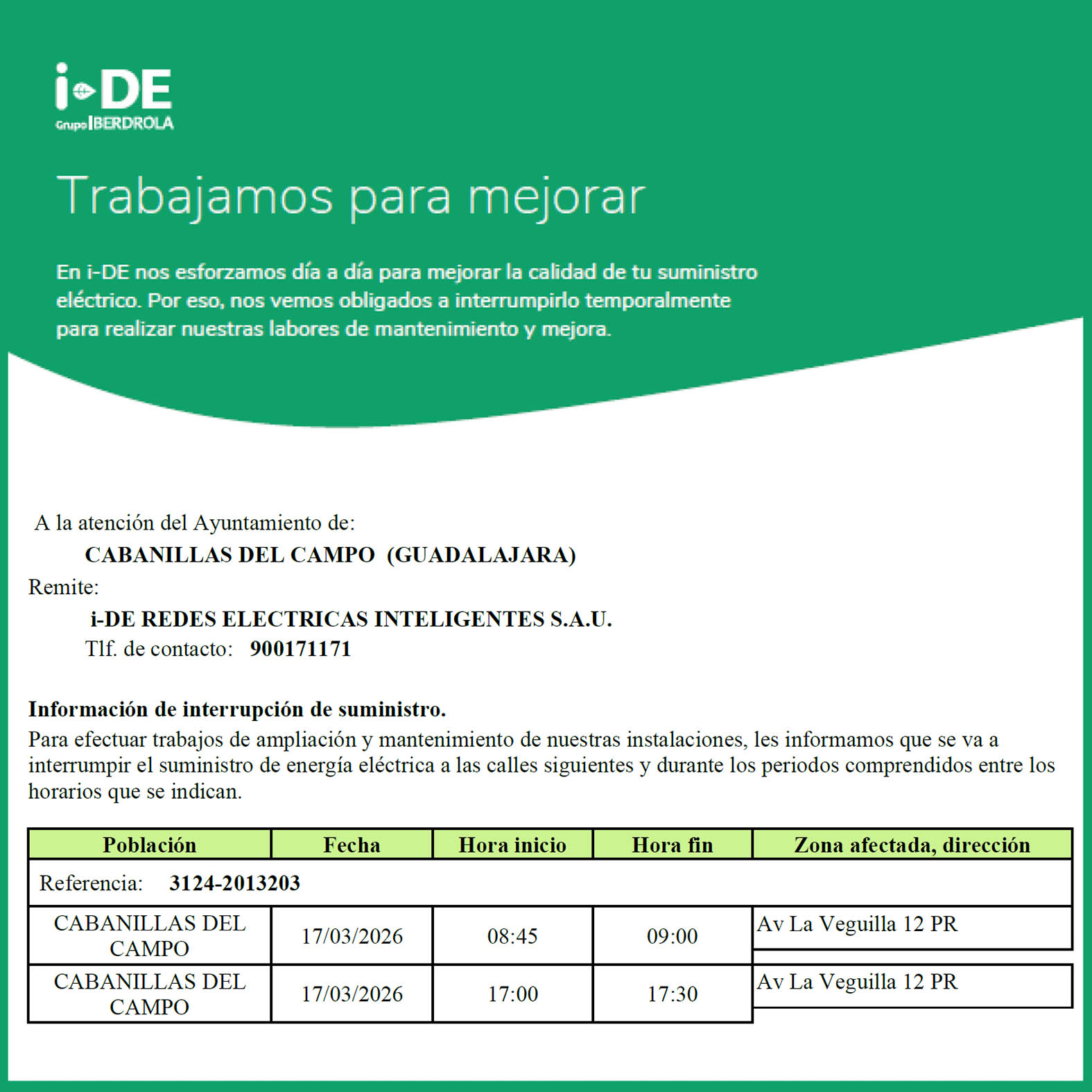 La compañía suministradora Iberdrola ha comunicado al Ayuntamiento de Cabanillas del Campo que, para efectuar trabajos de ampliación y mantenimiento de instalaciones, van a realizar dos cortes programados del suministro de energía eléctrica el próximo martes 17 de marzo de 2026.