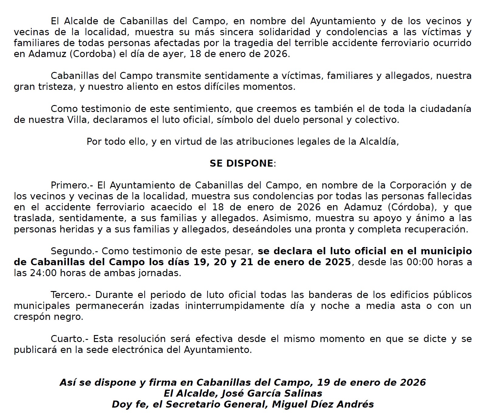 El alcalde de Cabanillas, José García Salinas, ha firmado un Decreto de Alcaldía por el que se declaran jornadas de luto oficial en la localidad los días 19, 20 y 21 de enero, con motivo de la tragedia ferroviaria acontecida este domingo en la provincia de Córdoba.