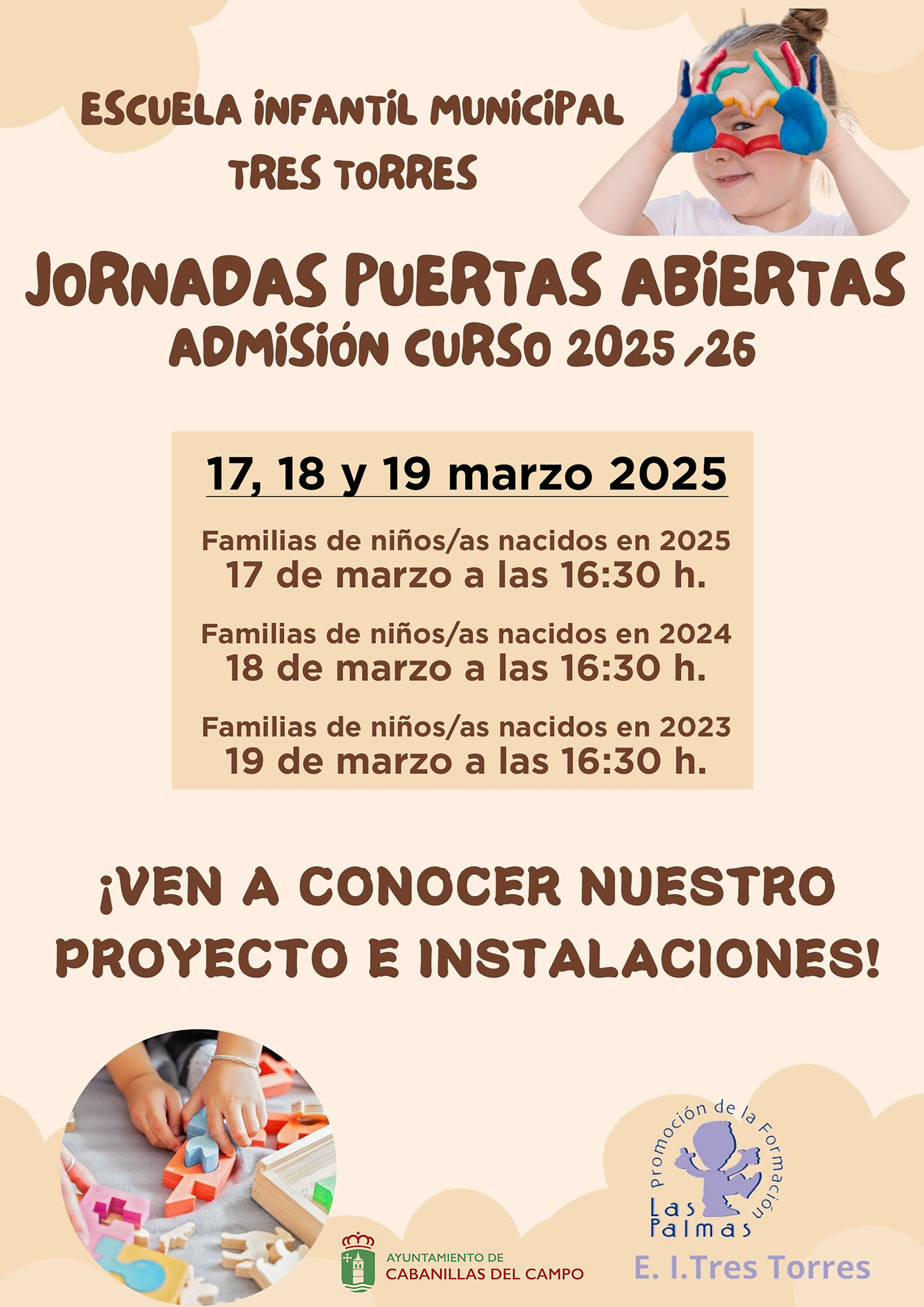De cara al proceso de solicitud de plazas y matriculación en el curso 2025-2026, que se abrirá el próximo mes de abril, la Escuela Infantil Municipal «Tres Torres» de Cabanillas del Campo organiza unas jornadas de puertas abiertas, para que las familias puedan conocer su proyecto e instalaciones. Las jornadas serán los días 17, 18 y 19 de marzo, con visitas a las 16:30 h.