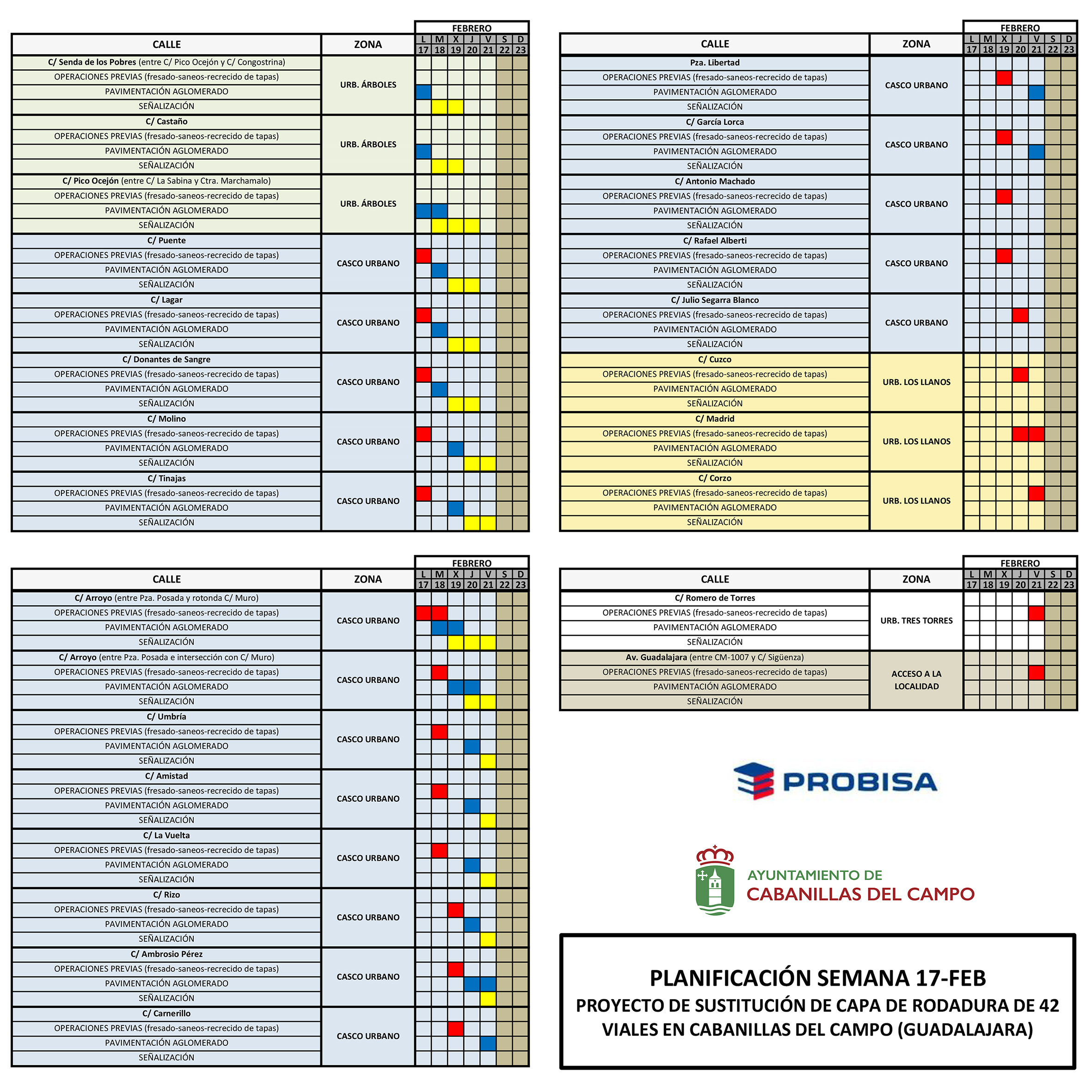 Dentro de la gran operación de asfaltados que se está desarrollando en Cabanillas, y que llegará a 42 calles de la localidad, se comunica que esta semana del 17 al 23 de febrero habrá trabajos en las siguientes vías del municipio: Senda de los Pobres, Castaño, Pico Ocejón, Puente, Lagar, Donantes de Sangre, Molino, Tinajas, Arroyo, Umbría, Amistad, La Vuelta, Rizo, Ambrosio Pérez, Carnerillo, Plaza de la Libertad, García Lorca, Antonio Machado, Rafael Alberti, Julio Segarra Blanco, Cuzco, Madrid, Corzo, Romero de Torres y Avenida Guadalajara.