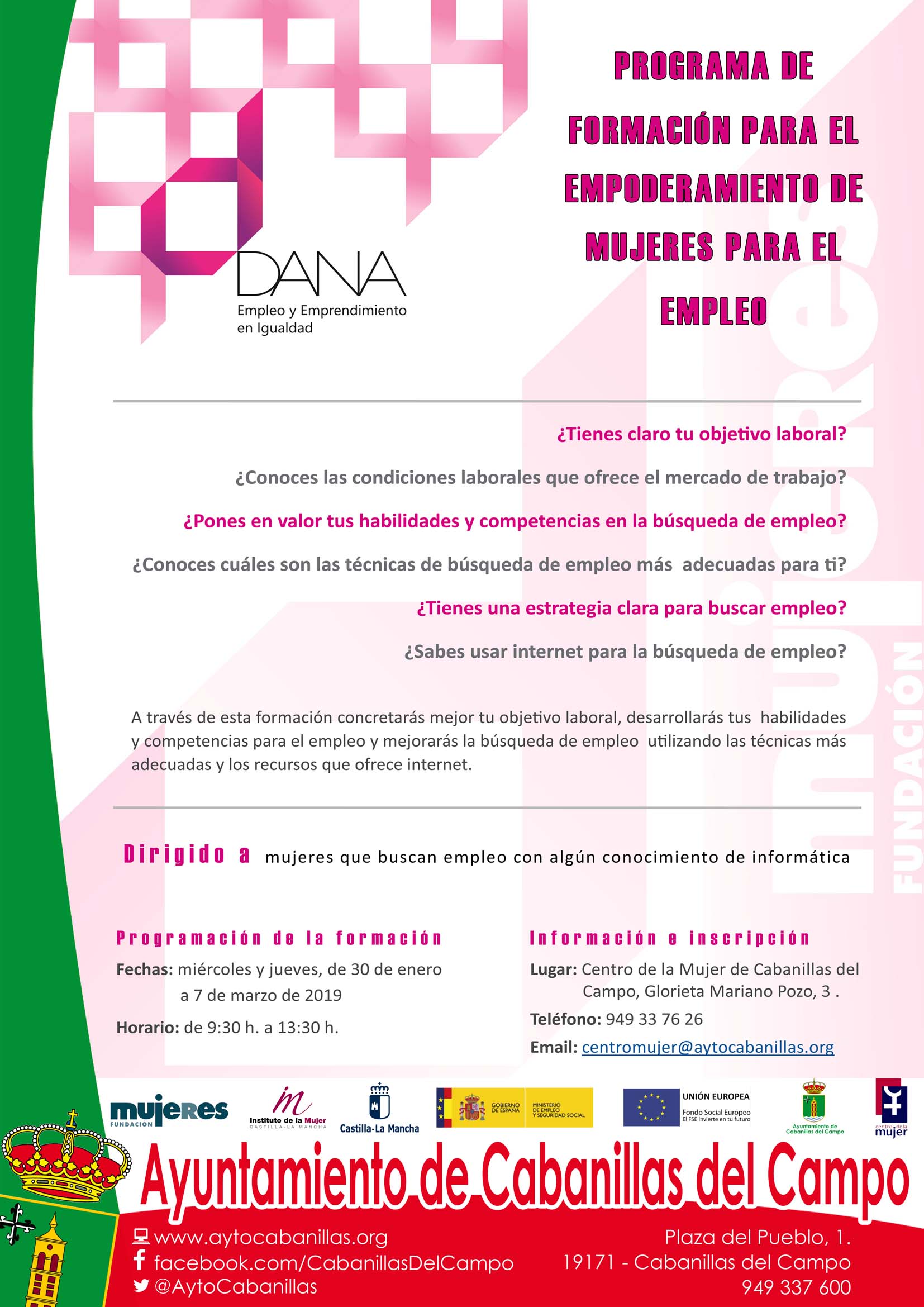 Cabe reseñar que el “DANA” es un proyecto de ámbito regional que pretende mejorar la empleabilidad de las mujeres de Castilla-La Mancha, a través de la adquisición y entrenamiento de las competencias y habilidades necesarias para afrontar en mejores condiciones su decisión hacia el empleo o el emprendimiento. Se trata de apoyar y acompañar a las mujeres a través de un itinerario de formación cuyo objetivo es su empoderamiento personal y un proceso de acompañamiento que apoye su camino hacia el empleo o el emprendimiento. En el caso del taller de Cabanillas, está dirigido a mujeres que buscan empleo y tengan algún conocimiento de informática.
