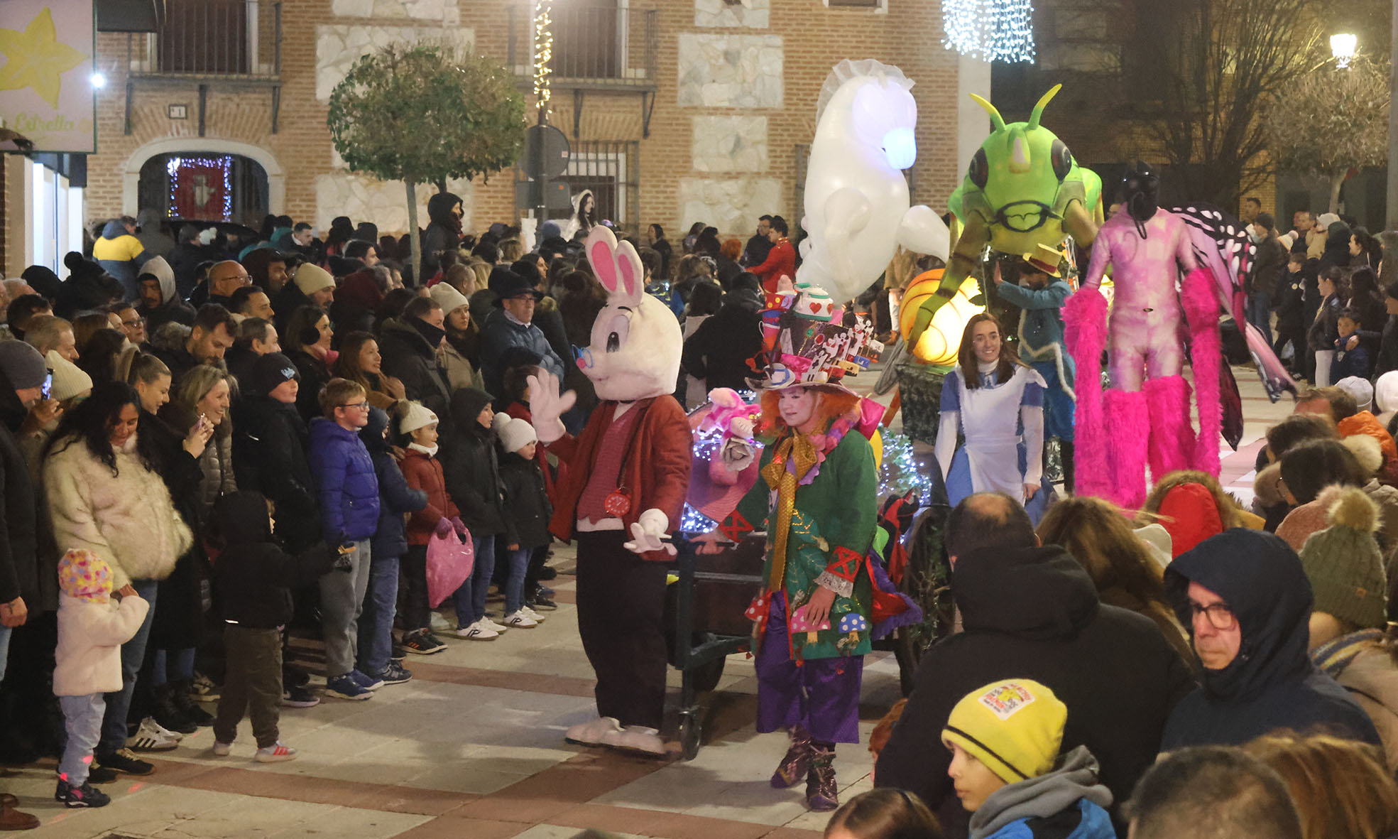 Pudieron verse populares muñecos infantiles, coches tuneados llenos de neones, dos carrozas ambientadas en “Alicia” y sus eternos personajes, otra sobre animales de la selva, y multitud de zancudos, malabaristas, danzantes, duendes del bosque, personajes del mundo del mar… y todo un carrusel multicolor que daba paso a una magnífica banda de cornetas y tambores que, interpretando villancicos, abría paso a la gran carroza final, en la que viajaban los tres Reyes de Oriente, acompañados de multitud de niños y niñas.