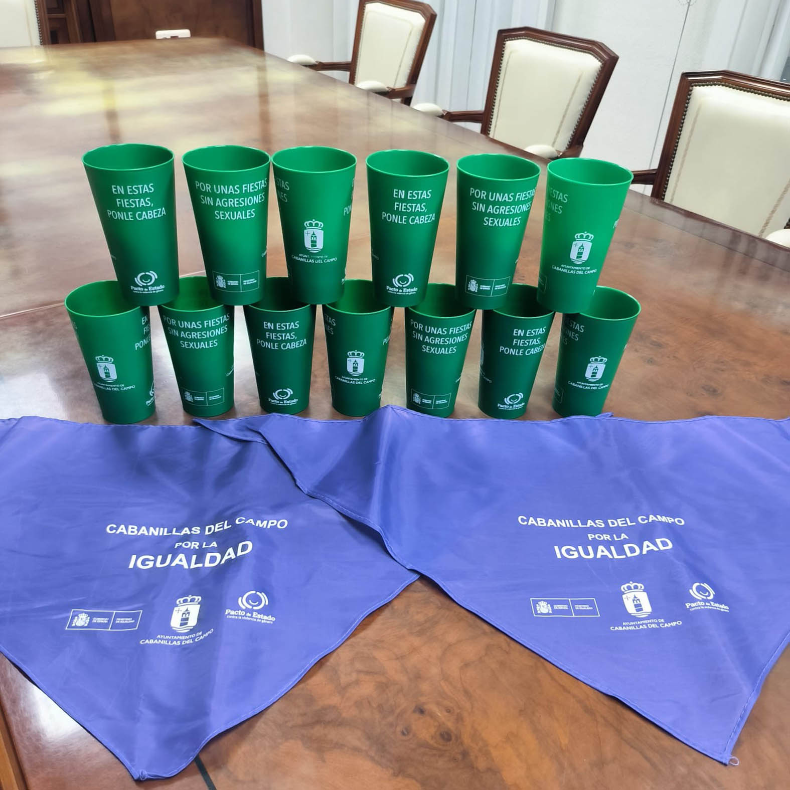 Los nuevos materiales son unas pañoletas moradas bajo el lema «Cabanillas del Campo por la Igualdad», y unos vasos verdes que llaman a tener unas «fiestas sin agresiones sexuales». Estos materiales publicitarios de la campaña se han financiado con cargo a los créditos recibidos de la Secretaría de Estado de Igualdad y contra la Violencia de Género del Ministerio de Igualdad.