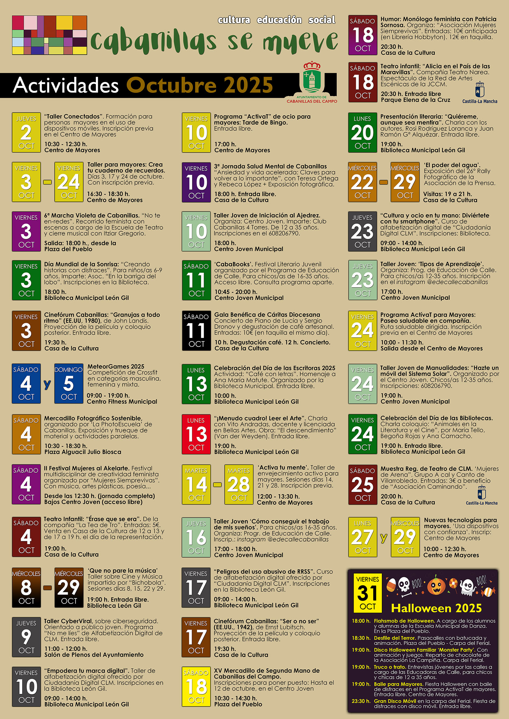 Disponible para consulta y descarga el cartel mensual de actividades socioculturales «Cabanillas se mueve» de octubre de 2025