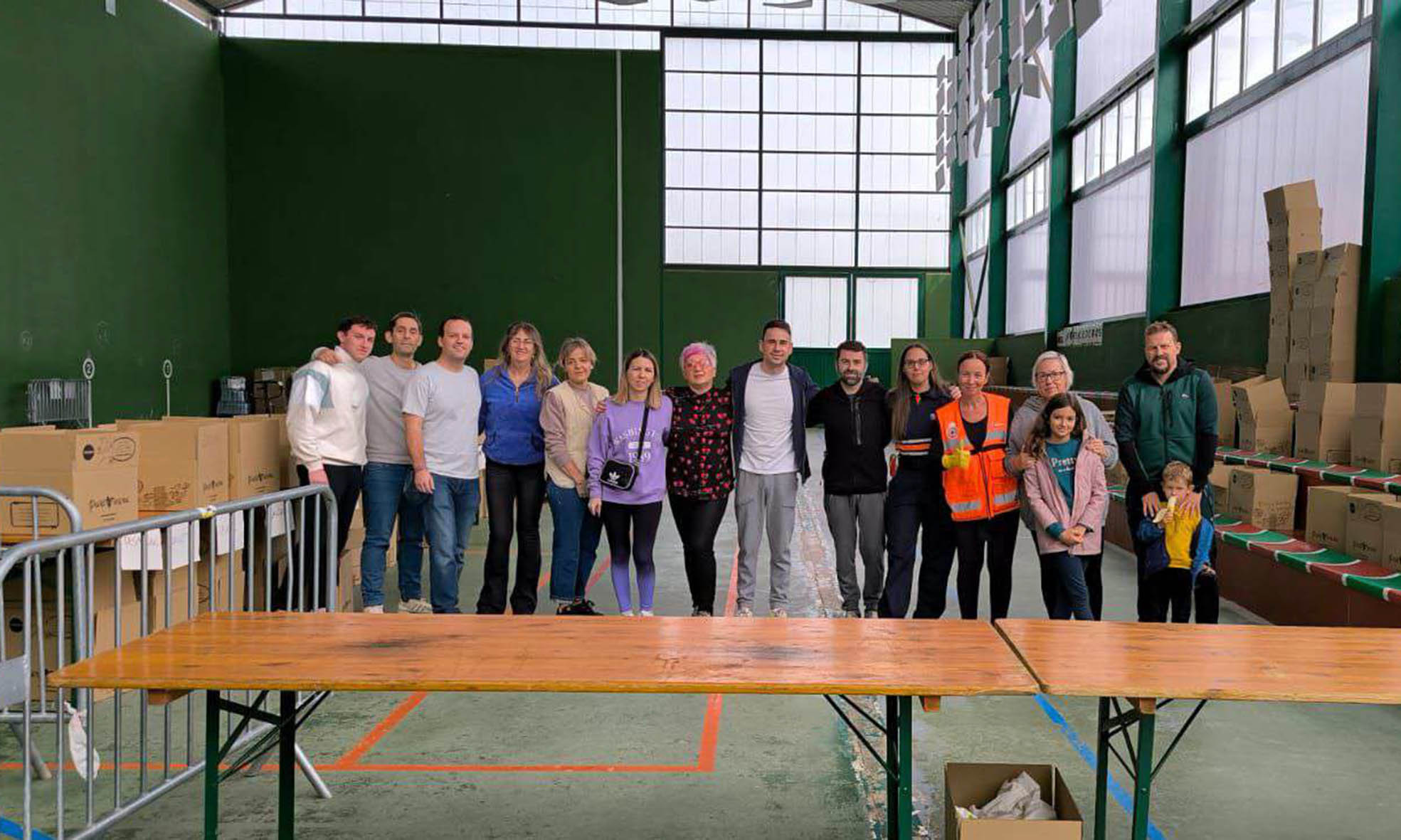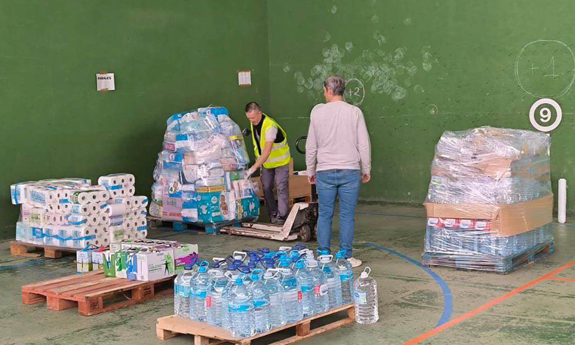 Casi 40 palets de materiales de primera necesidad se recogieron de viernes a domingo en el Frontón Municipal; y este mismo lunes la ayuda sale de camino a Valencia