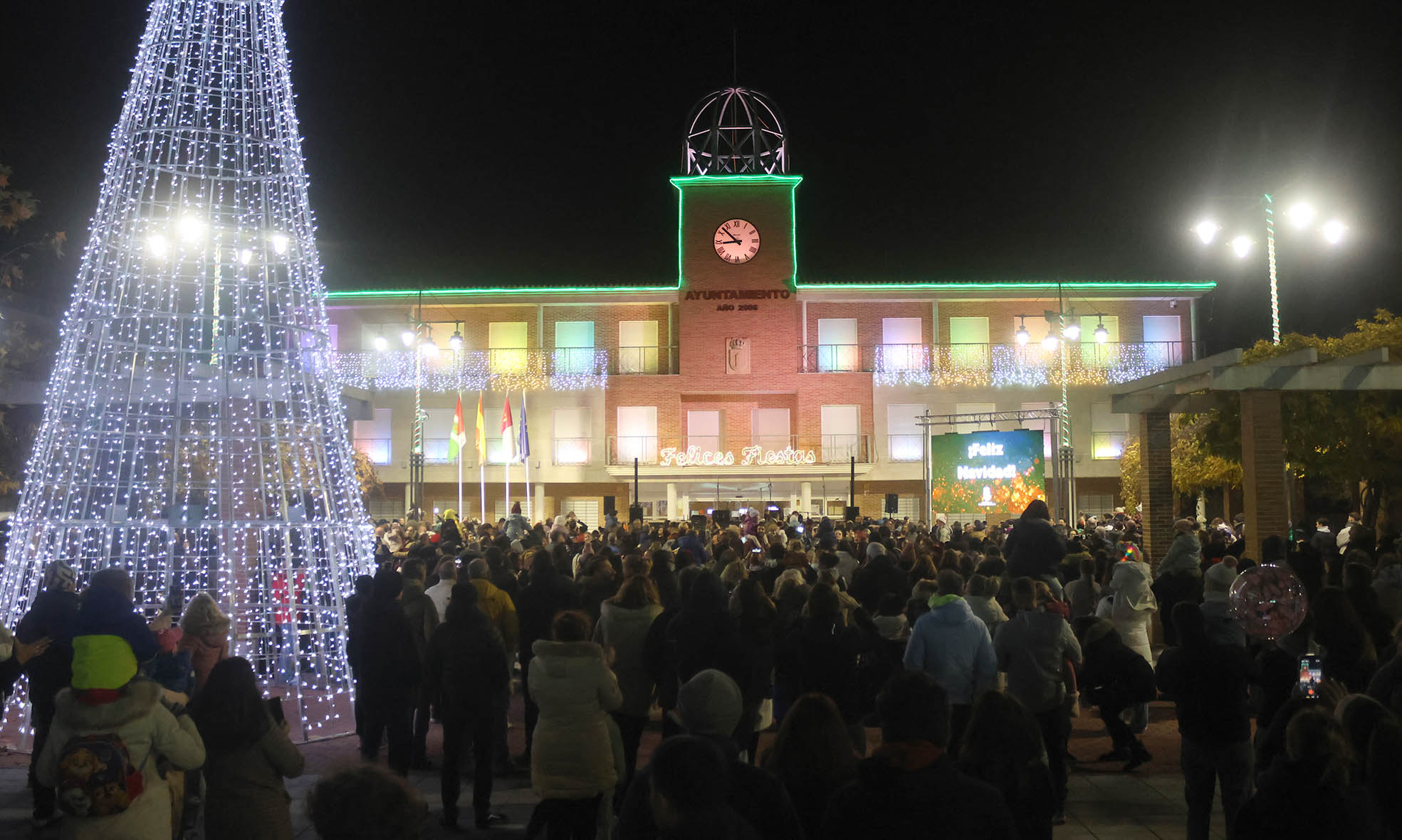 Centenares de vecinos y vecinas abarrotaron la Plaza del Pueblo en la tarde-noche de este viernes 12 de diciembre, para participar del acto de pistoletazo inicial a las fiestas de Navidad en Cabanillas del Campo.