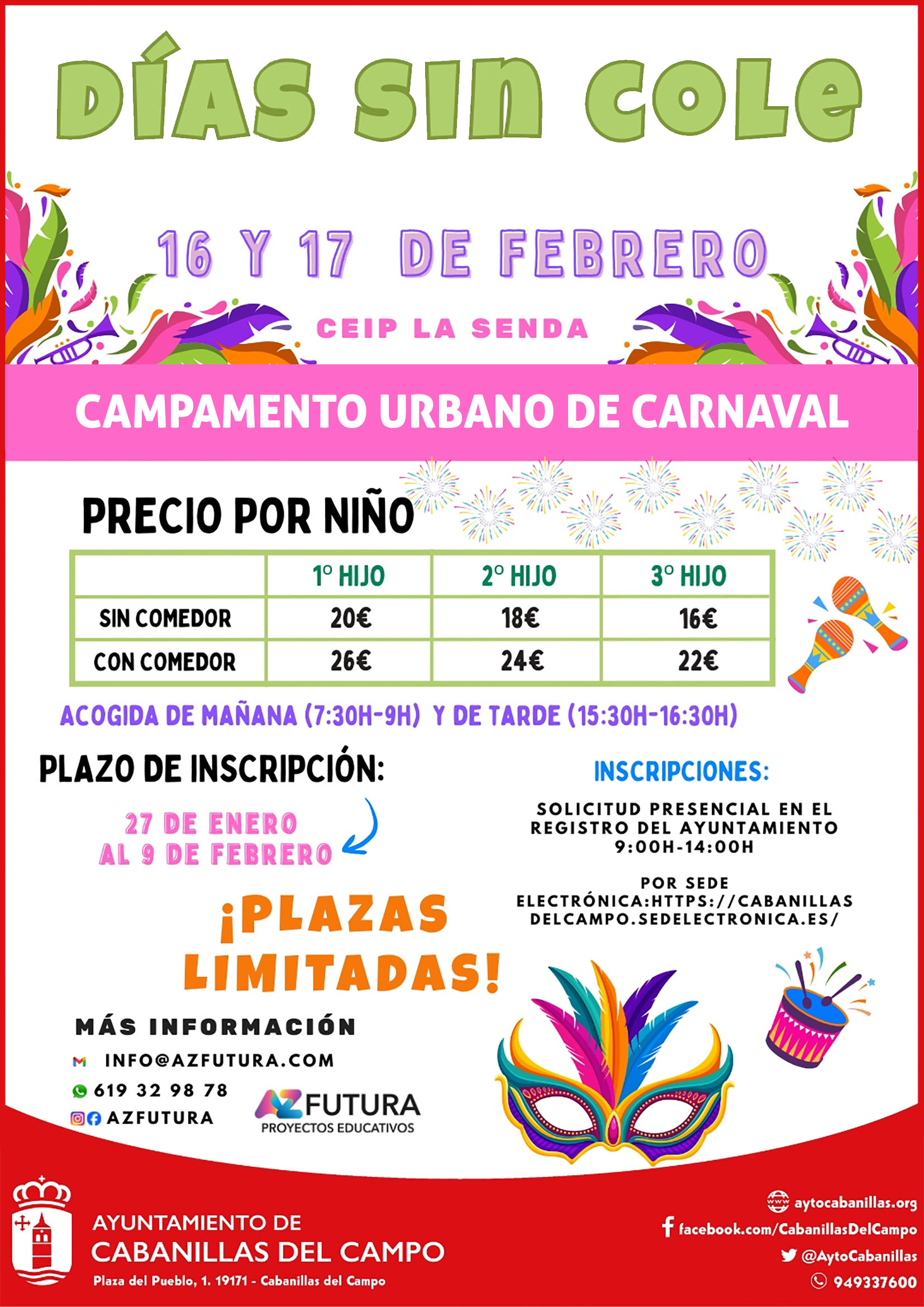 El Ayuntamiento de Cabanillas del Campo organiza una vez más un servicio de Campamento Urbano para dos jornadas laborables no lectivas que están programadas con motivo del «descanso de Carnaval» en los centros educativos, los próximos lunes 16 y martes 17 de febrero de 2026. Se trata de un servicio que pretende ayudar a facilitar la conciliación de las familias de la localidad, y que está destinado a niños y niñas de 3 a 12 años (debiendo los de 3 años estar ya escolarizados en el presente curso escolar 2025-2026).