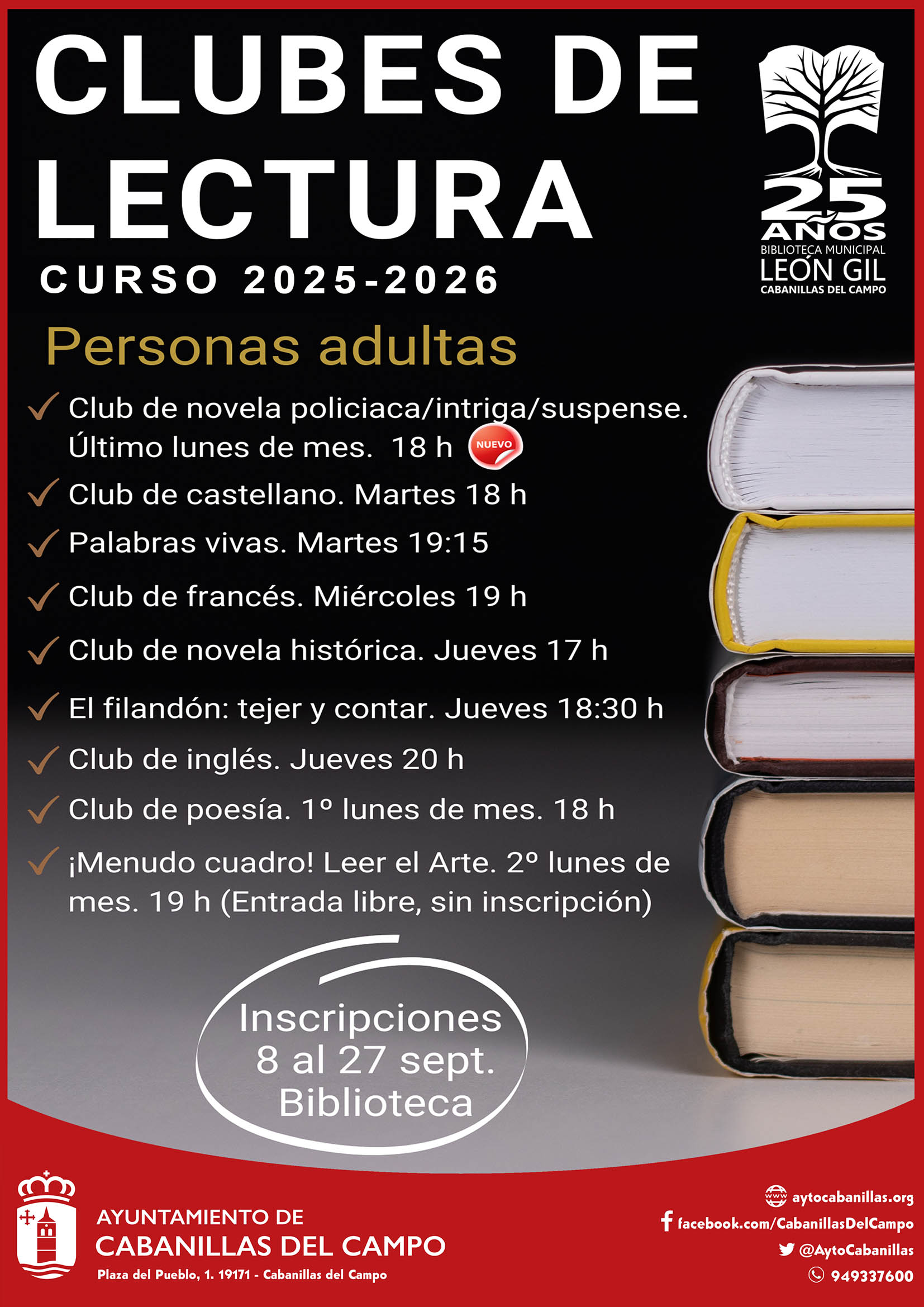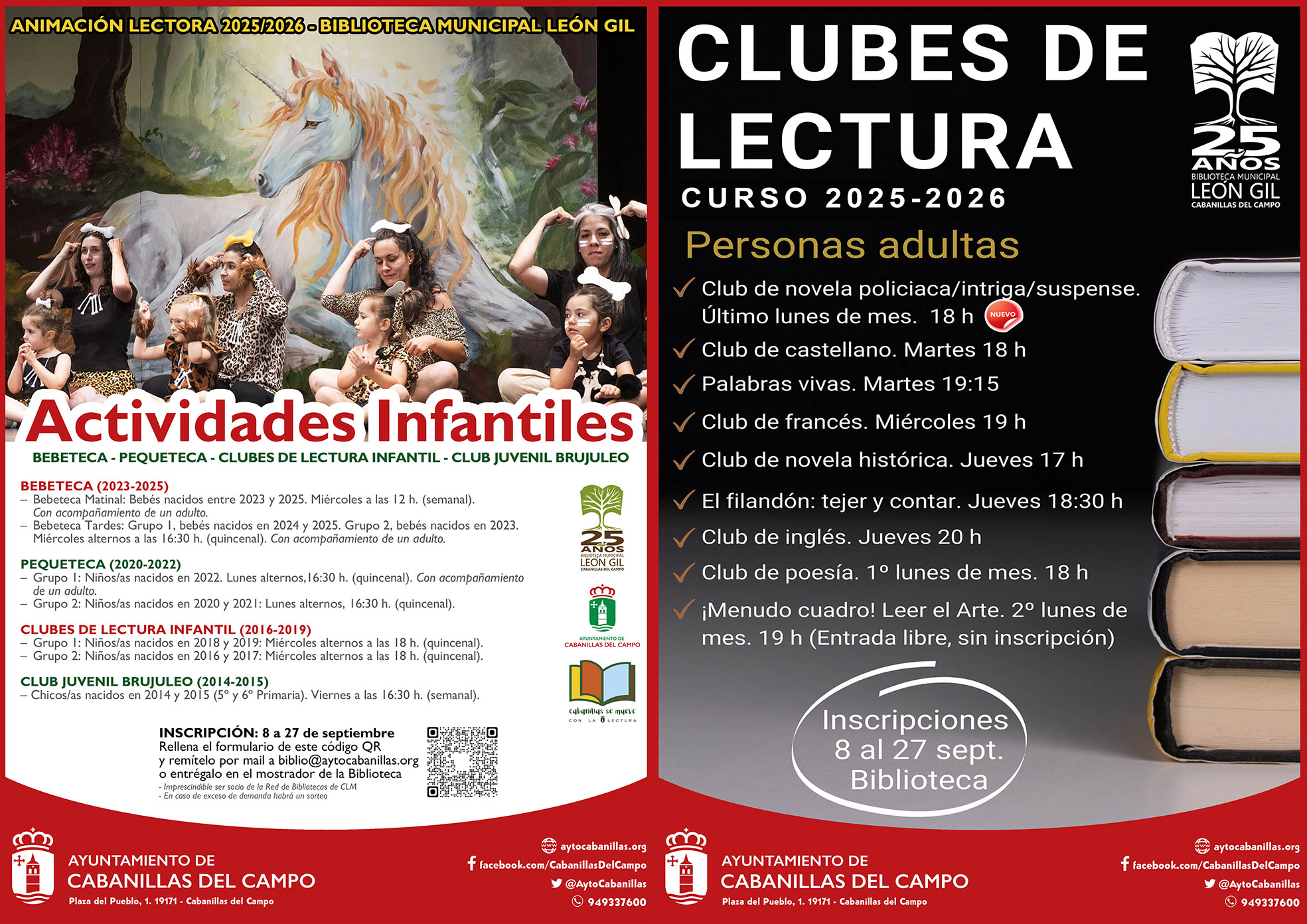La Biblioteca Municipal León Gil de Cabanillas del Campo ya ha preparado toda la oferta de su Programa de Animación Lectora para el curso 2025-2026, con clubes y talleres que se desarrollarán desde octubre hasta junio del año próximo. En total hay 14 clubes y talleres de lectura en cartera, con cinco propuestas para público infantil-juvenil, y nueve para público adulto. El plazo de inscripción a todas ellas se abre el próximo lunes 8 de septiembre, y se extiende hasta el sábado 27.