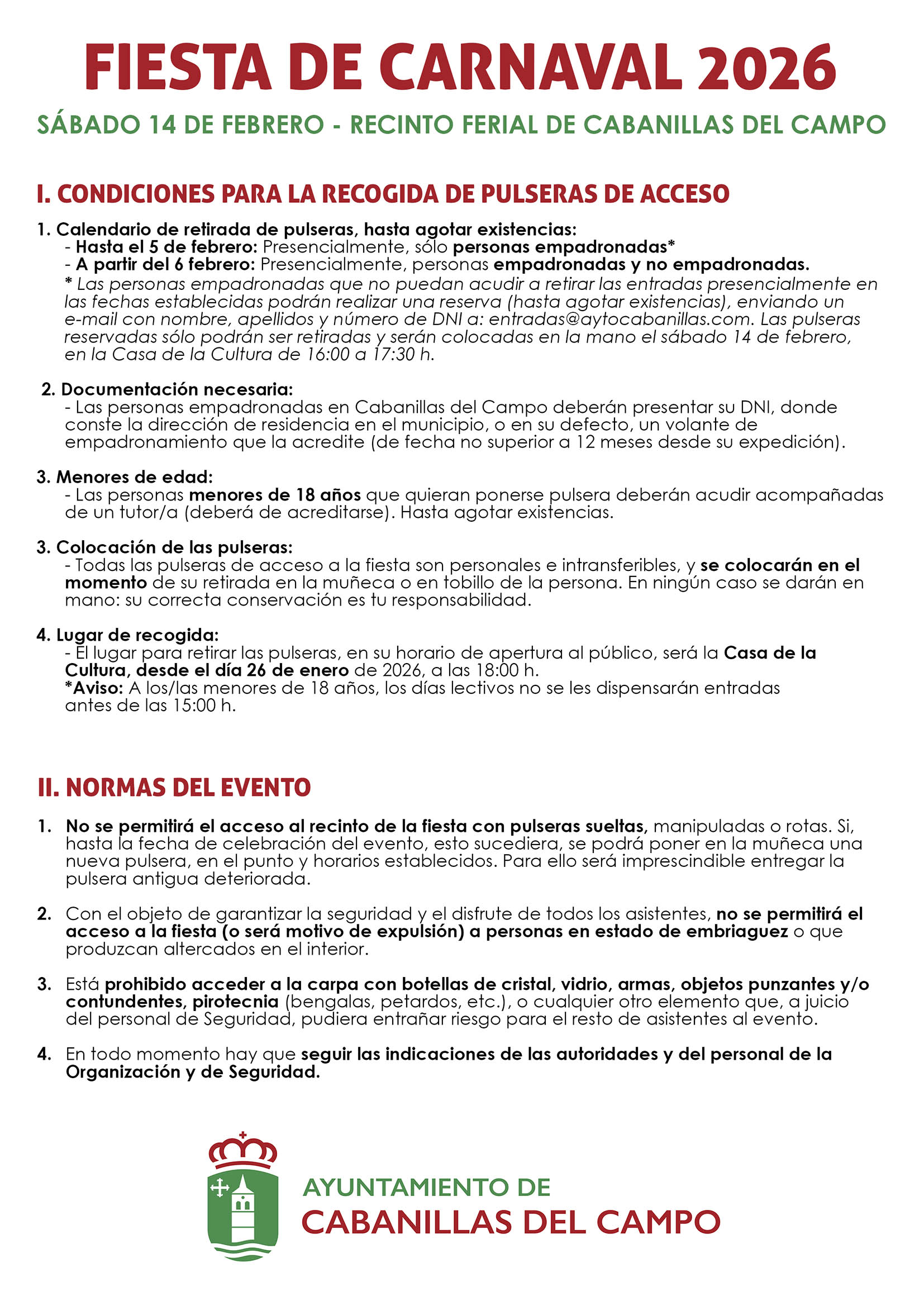 Las pulseras de entrada podrán conseguirse en la Casa de la Cultura de Cabanillas desde las 18:00 horas de este 26 de enero, en el horario de apertura al público de la instalación. Para acreditar la condición de empadronado habrá que presentar un DNI en el que conste la dirección de residencia en el municipio, o en su defecto, un volante de empadronamiento extendido con una antigüedad no mayor a 12 meses.