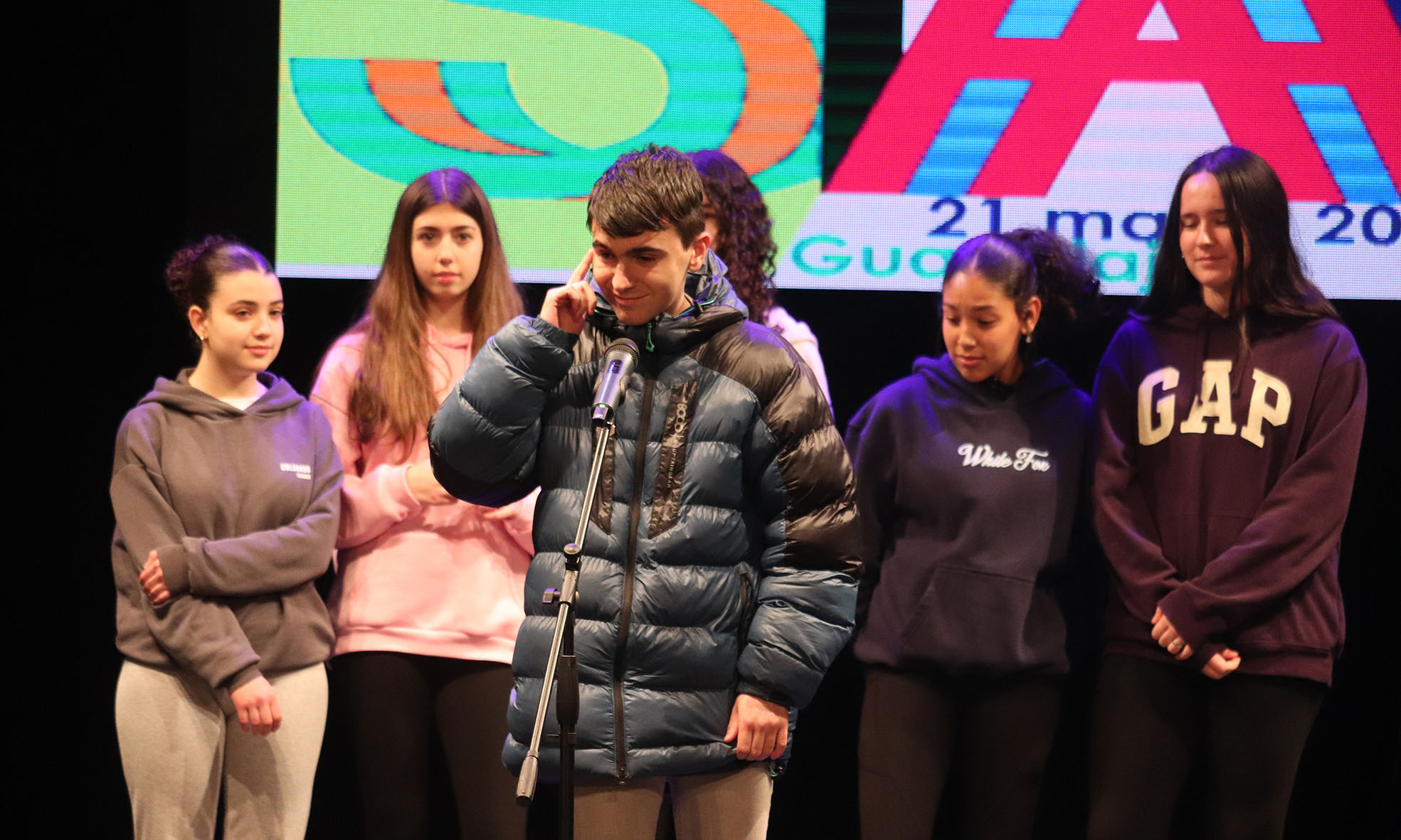 El evento estuvo además presentado y amenizado por las actuaciones intercaladas de «Jesuns JS», un fantástico rapero llegado desde Fuenlabrada, que es experto en improvisación y el estilo conocido como «freestyle». Jesuns tuvo muy buena conexión con la chavalada, especialmente cada vez que subía al escenario a los docentes que les acompañaban, con quienes practicó diversos juegos de improvisación rapera. Lo cierto es que los profesores y profesoras del instituto, del área de Lengua y Literatura, se «dejaron hacer» y pusieron todo de su parte para animar a sus chicos y chicas.