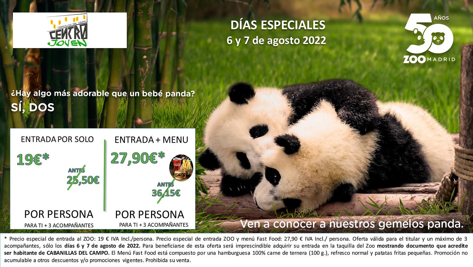 – En el caso del Zoo de Madrid, los días con descuento para Cabanillas son el sábado 6 y el domingo 7 de agosto, en el que los vecinos y vecinas empadronados podrán adquirir su entrada por sólo 19 euros (o 27’90 con menú incluido). Esta oferta es válida para adquirir entrada hasta para tres acompañantes más, estén o no empadronados.