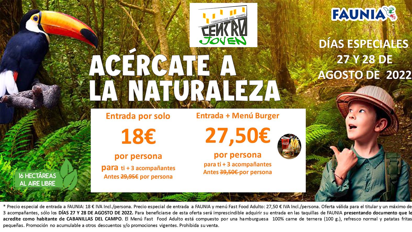 – Finalmente, para el parque de animales «Faunia», los «open day» de Cabanillas serán los días sábado 27 y domingo 28 de agosto, en el que la entrada se fija en 18 euros por persona (27’50 con un menú incluido). También se pueden adquirir a este precio por parte de empadronados hasta para tres acompañantes más.