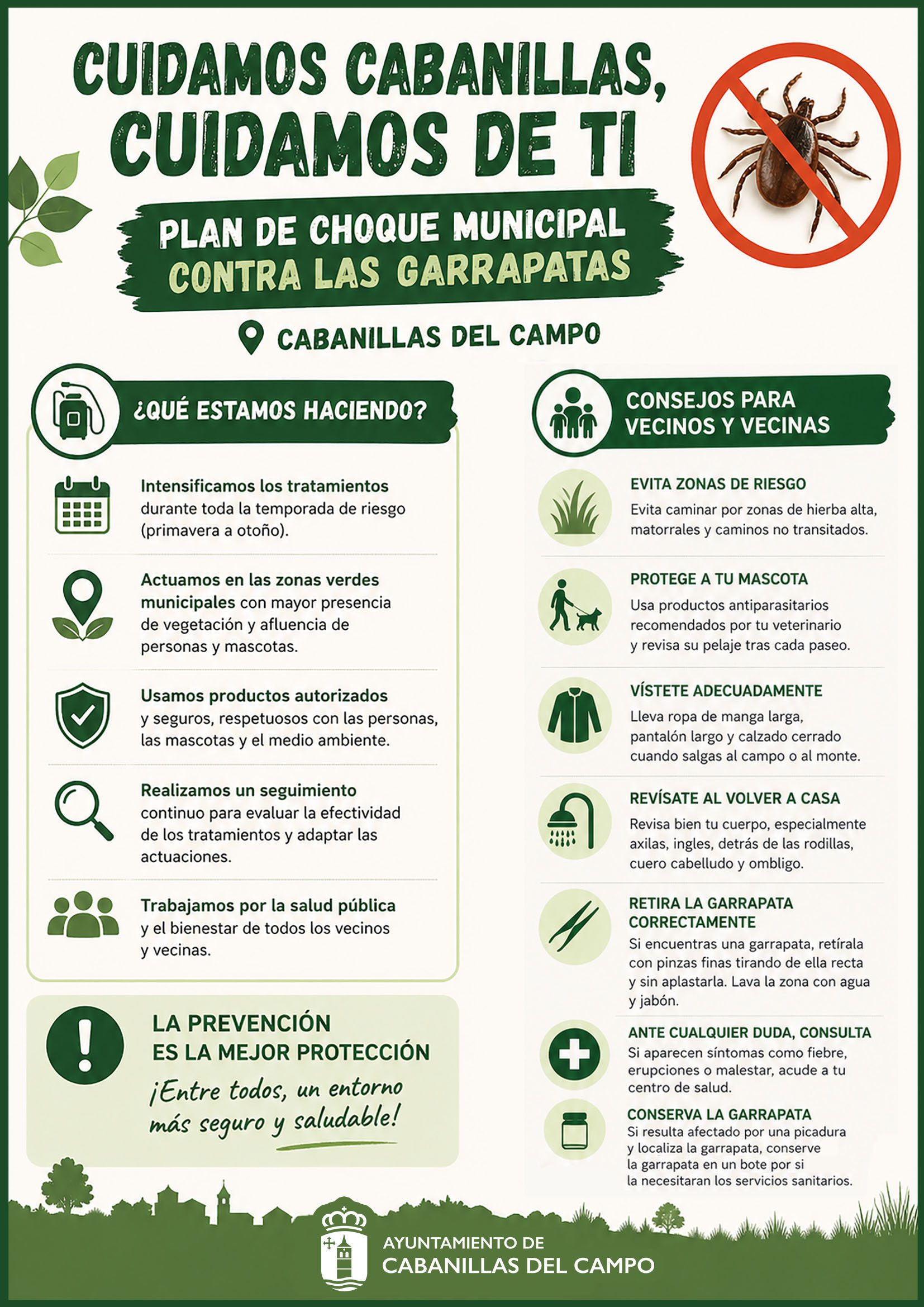 El Ayuntamiento de Cabanillas del Campo está intensificando los habituales tratamientos preventivos contra presencia de garrapatas, propios de esta época del año, con un plan de choque y refuerzo que ha comenzado ya, y se culminará en los próximos días. La aplicación de un plan de choque se debe a que la campaña primaveral está siendo especialmente compleja este año en este sentido, algo que está estrechamente relacionado también con la proliferación de maleza de esta primavera.