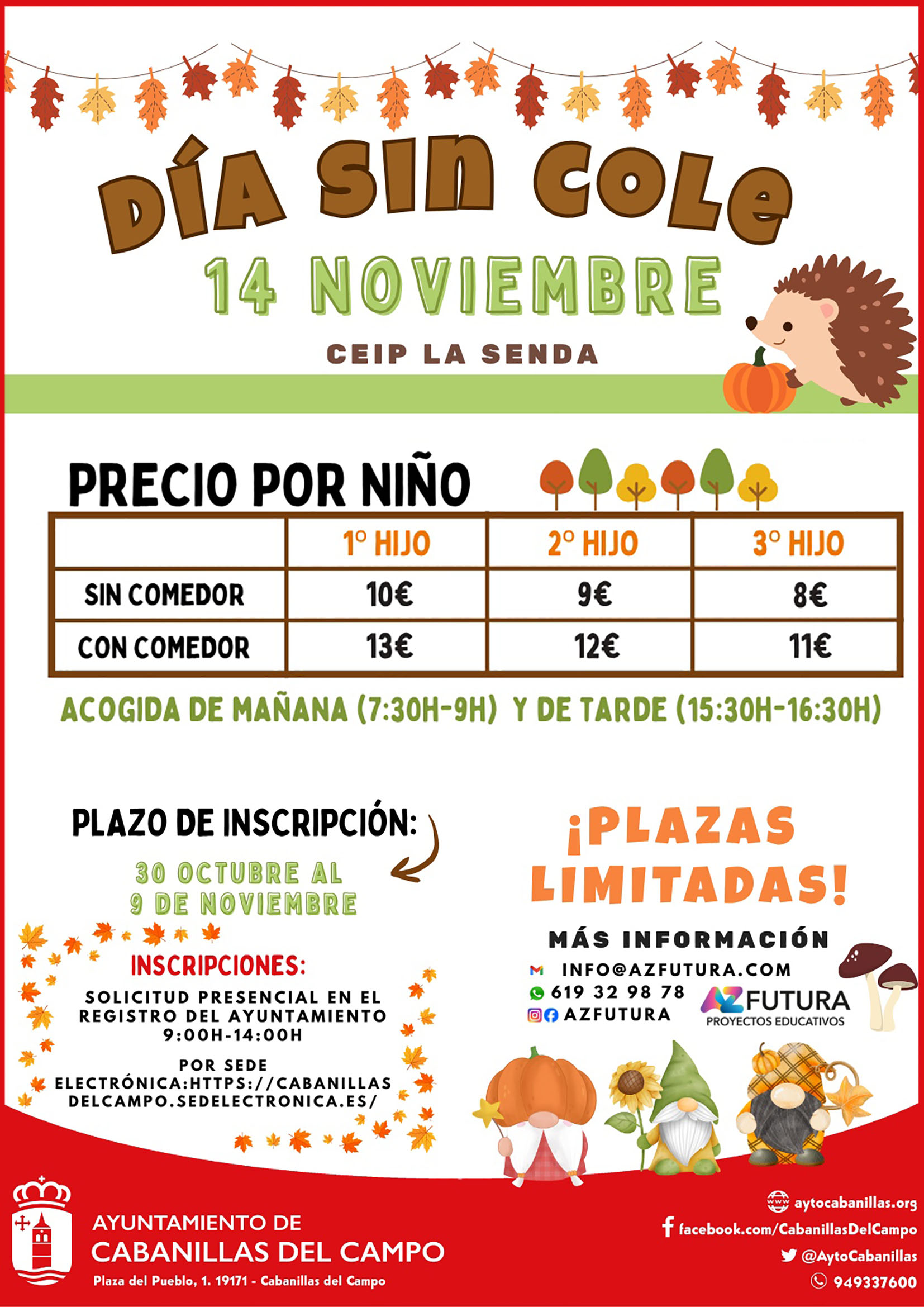 El precio de la jornada de campamento es de 10 euros sin comedor y 13 euros si se incluye servicio de comedor, y hay descuentos habilitados a partir del segundo hijo o hija matriculado. El horario es el mismo que el de cualquier jornada escolar, con las actividades previstas de 9 a 14 horas. No obstante, existe la posibilidad de llevar a los «peques» a un aula matinal de acogida temprana, de 7:30 a 9:00 h. (en la que además pueden desayunar, aunque para ello hay que llevar el desayuno desde casa); y también hay posibilidad de dejar a los inscritos e inscritas en el servicio de comedor, de 14:00 a 15:30 h. Asimismo, se da opción de una hora extra más de ampliación, como acogida de tarde, tras el comedor, hasta las 16:30 h.