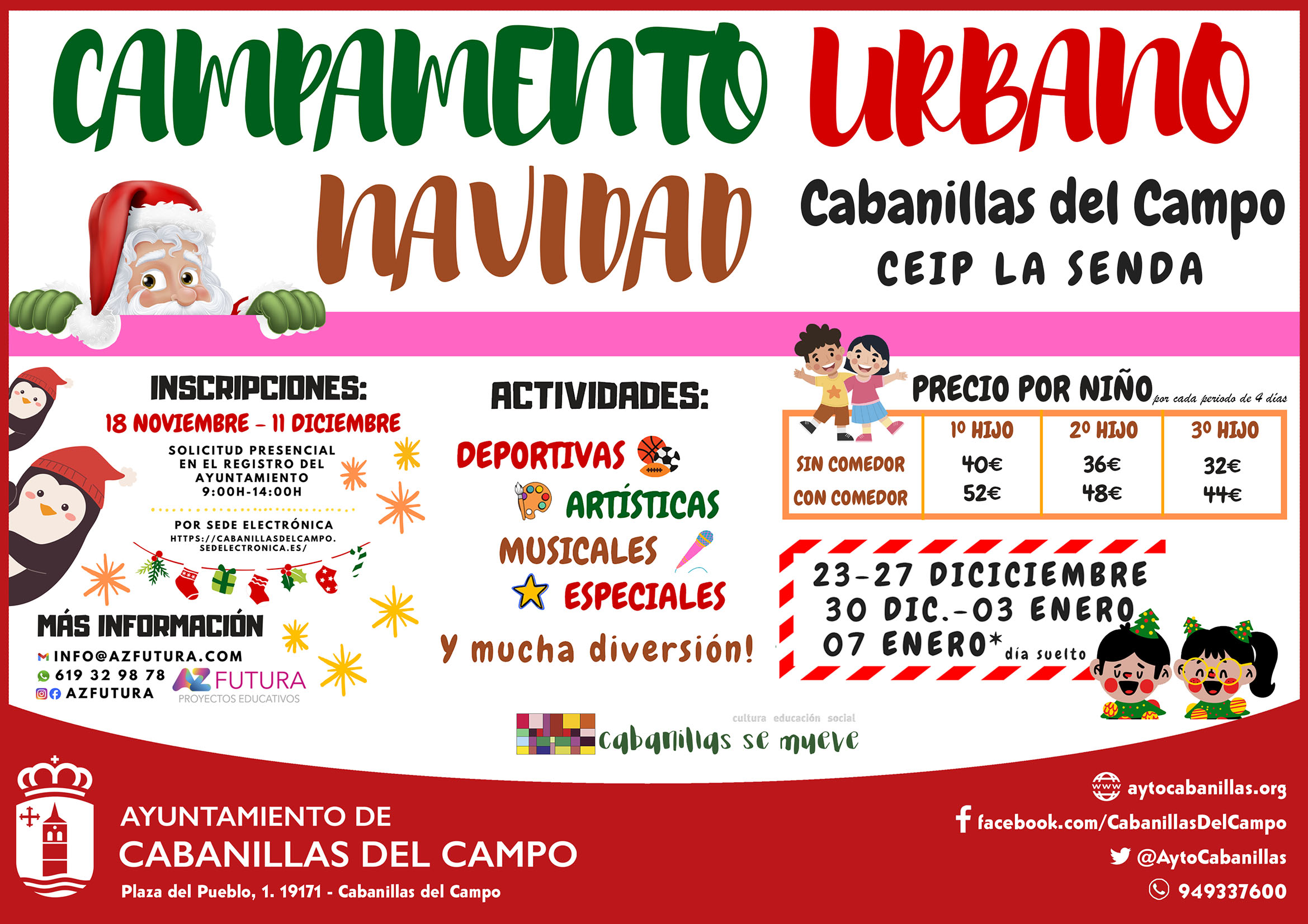 Como es habitual en cada periodo de descanso escolar, el Ayuntamiento de Cabanillas del Campo ofrecerá en las próximas Navidades un Campamento Urbano destinado a niños y niñas de entre 3 y 12 años. Se trata de un servicio pensado para ayudar a facilitar la conciliación de las familias de la localidad durante las vacaciones escolares, en aquellas jornadas que no son festivas o de fin de semana. El campamento se ofrecerá en las instalaciones del Colegio La Senda, entre el 23 de diciembre y el 7 de enero, con tres periodos para la posible contratación: Uno de cuatro jornadas, para los días 23, 24, 26 y 27 de diciembre; otro, también de cuatro jornadas, para los días 30-31 de diciembre y 2-3 de enero; y un tercer periodo con el día suelto del martes 7 de enero.