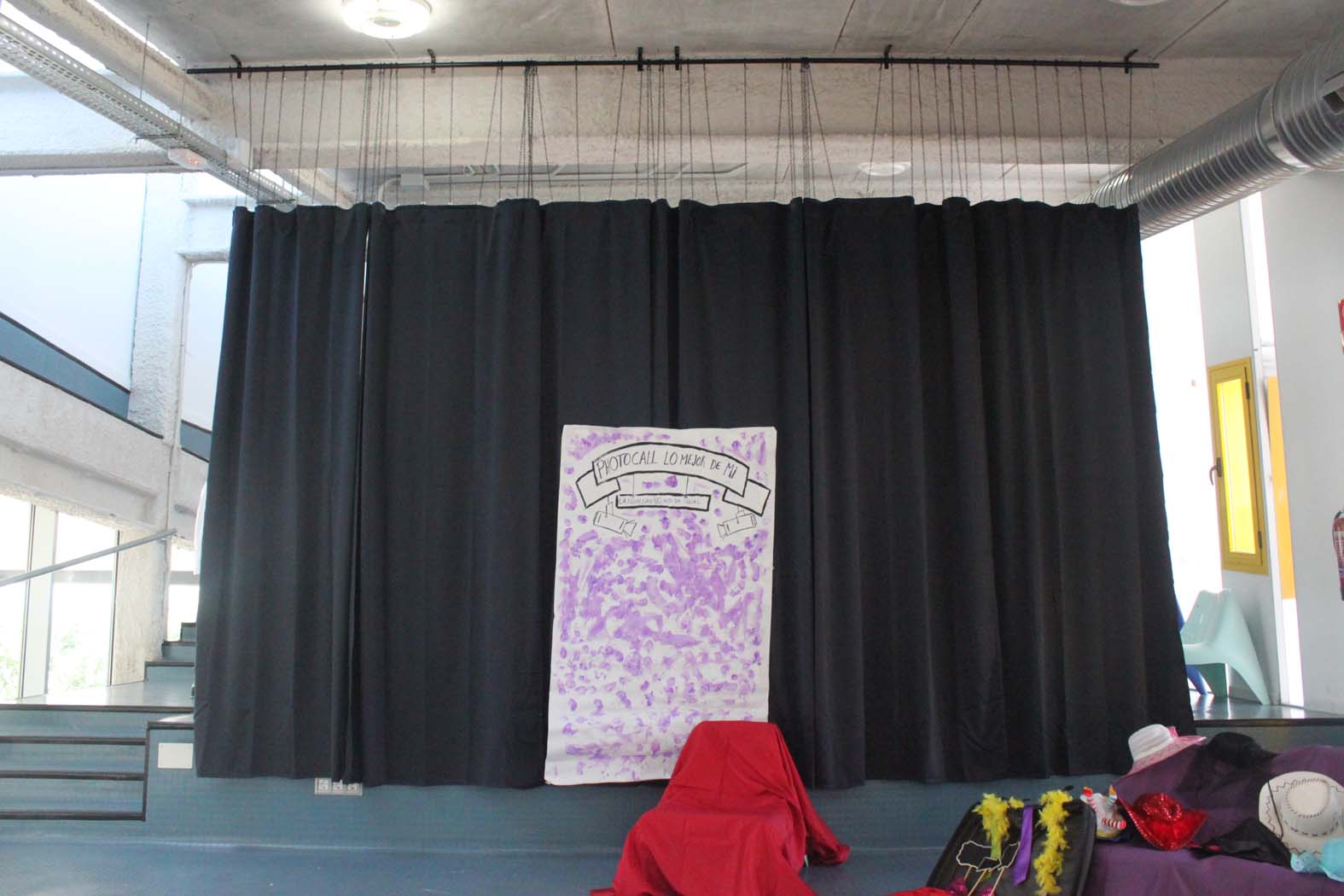 Además de las obras anteriores, el graderío escalonado de la planta inferior cuenta ahora con un nuevo cortinaje móvil de separación. Se trata de un elemento que permite crear un pequeño escenario para eventos de pequeño formato. Esta cortina se puede retirar si se precisa utilizar todo el graderío en su integridad.