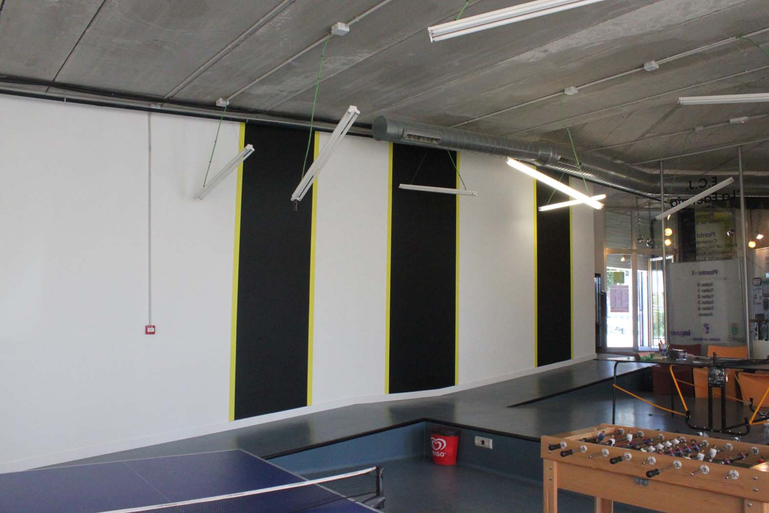 Así, la obra más llamativa es la separación con un gran tabique de las plantas intermedia y baja de la instalación. Esta obra tiene como objetivo principal insonorizar una estancia respecto a la otra, y permitir la realización de actividades simultáneas diferentes en ambos espacios, sin que el ruido de unas moleste a las otras. Este gran tabique además tiene la peculiaridad de disponer de unos espacios intermedios intercalados de material de pizarra, que se pueden utilizar para escribir o dibujar sobre ellos.