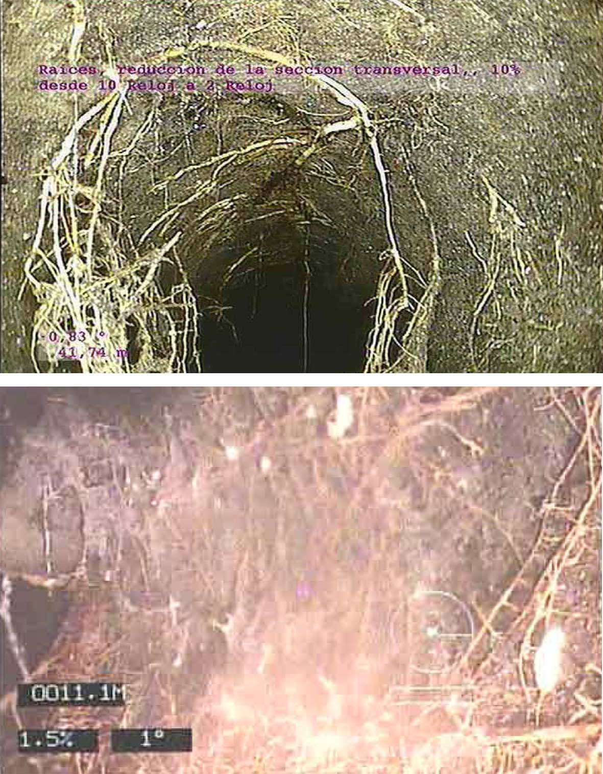 Ejemplos de daños causados por las raíces en tuberías de abastecimiento, en fotos tomadas con cámara subterránea