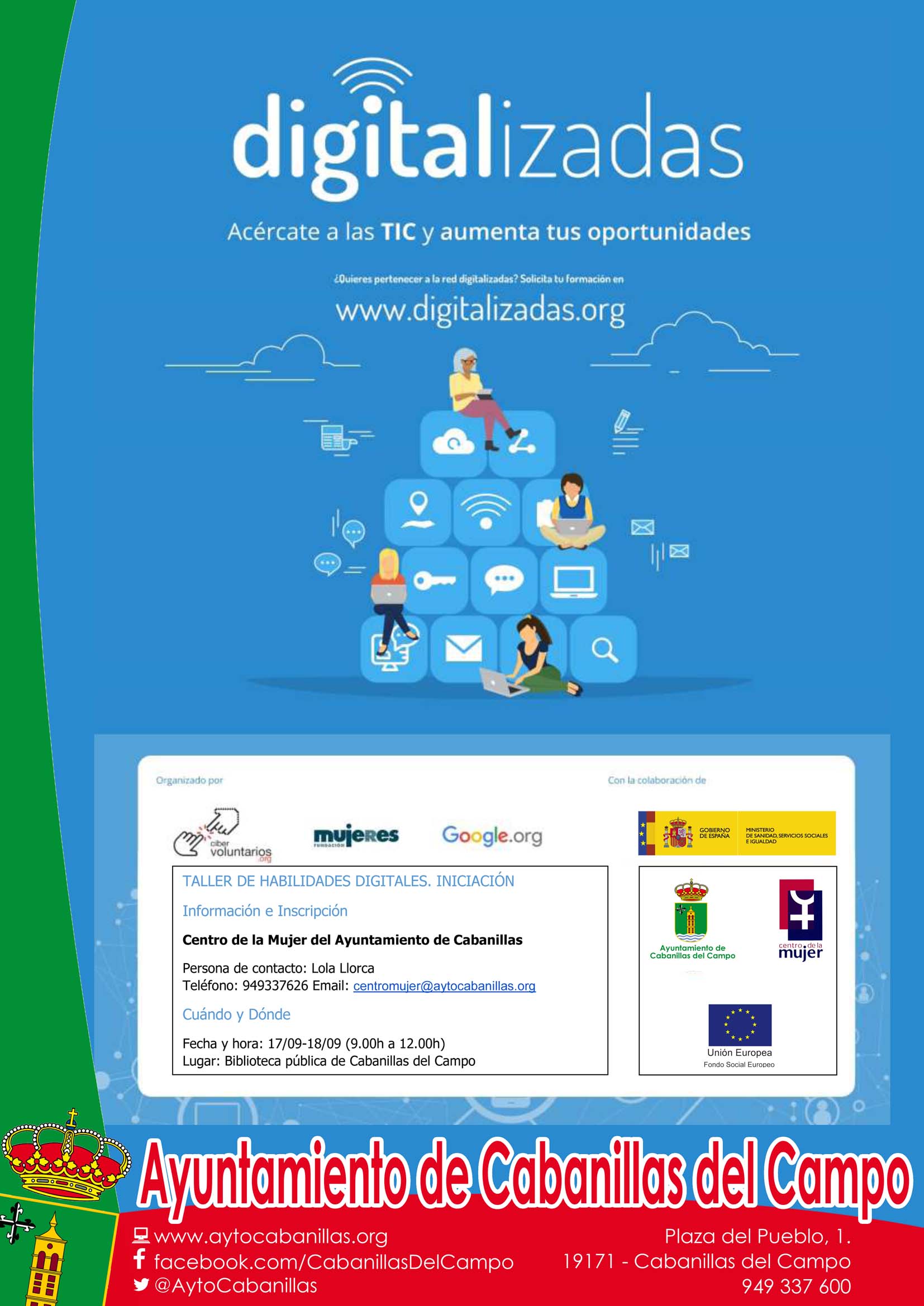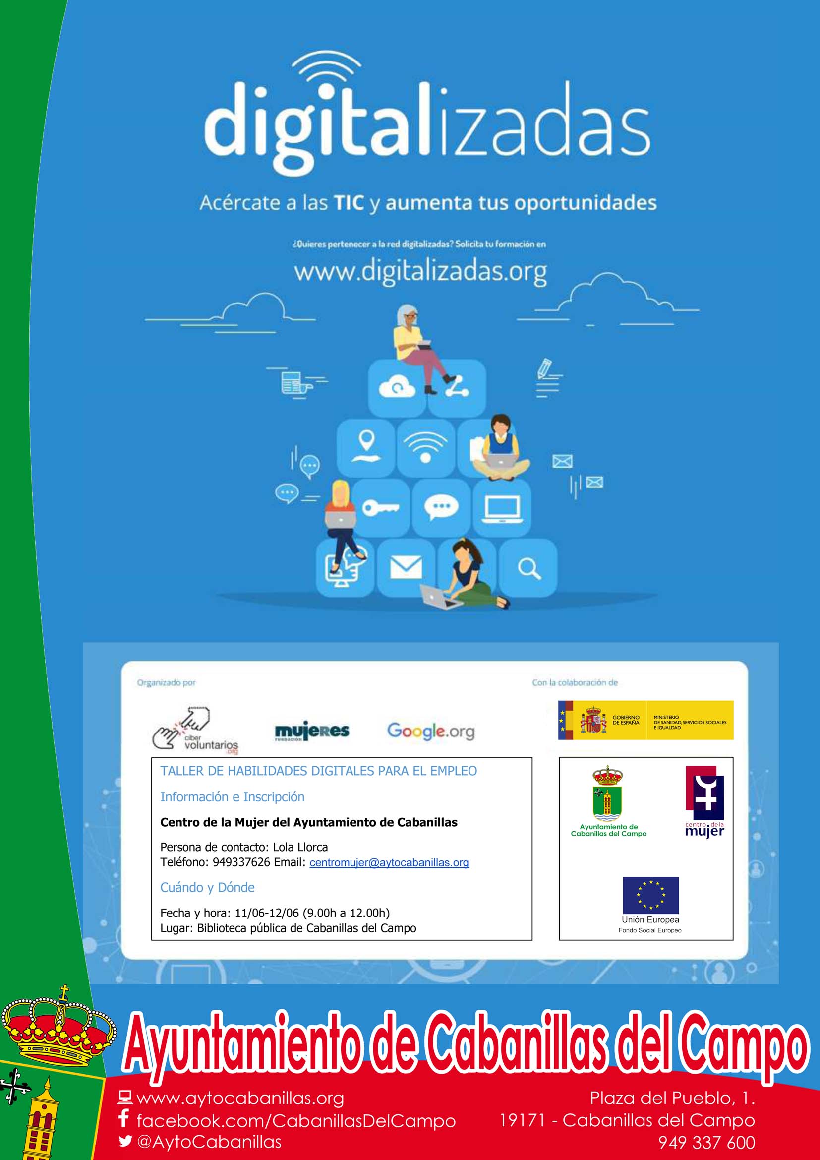 El Taller de Habilidades Digitales para el Empleo pertenece al programa «Digitalizadas» que impulsan las entidades «CiberVoluntarios.org», «Fundación Mujeres» y la Fundación Google.org, en colaboración con el Ministerio de Sanidad, Servicios Sociales e Igualdad, el Fondo Social Europeo, el Centro de la Mujer y el Ayuntamiento de Cabanillas. Se celebrará los días 11 y 12 de junio, en horario de 9 a 12 horas, en la Biblioteca Municipal, y las mujeres interesadas pueden inscribirse en el Centro de la Mujer de Cabanillas (en la Glorieta Mariano Pozo), o contactando con el 949337626 o el mail centromujer@aytocabanillas.org.