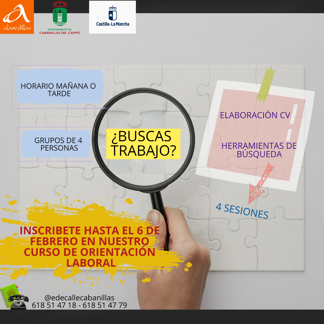 El Programa de Educación de Calle de Cabanillas del Campo ha lanzado un curso de formación destinado a jóvenes desde 16 años de edad, que tiene como objeto formar a los chicos y chicas del municipio en técnicas de búsqueda de empleo. Se tratarán cuestiones como la elaboración de currículum vitae, cuáles son las mejores herramientas de búsqueda que hay en la red, los recursos públicos a los que se debe recurrir, o cómo afrontar una entrevista de trabajo.