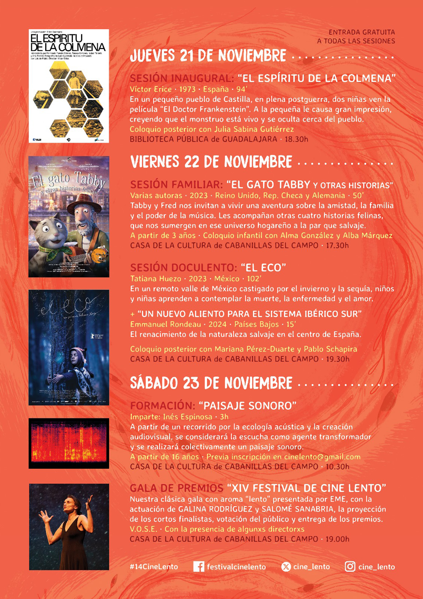 - 19:00 h. Gala de Premios: Gala con “aroma lento”, presentada por EME, con la actuación de GALINA RODRÍGUEZ y SALOMÉ SANABRIA, la proyección de los cortos finalistas, votación del público y entrega de los premios del XIV Certamen de Cine Lento. Entrada gratuita (Invitaciones en la Casa de la Cultura o El Rincón Lento).