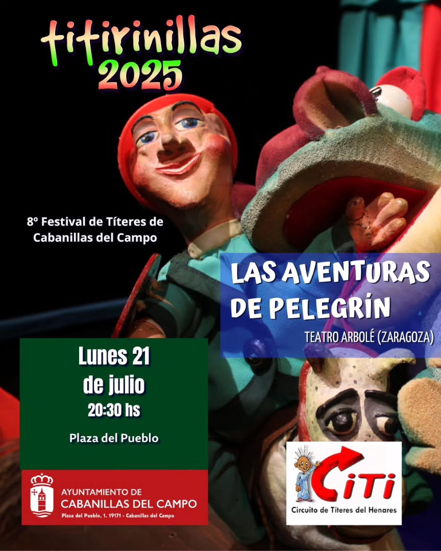Tercera y última entrega de la octava edición del Festival de Títeres de Cabanillas «Titirinillas 2025», organizada por el Ayuntamiento de Cabanillas del Campo. Los niños y niñas podrán disfrutar de la compañía zaragozana «Teatro Arbolé»  y su obra «Las aventuras de Pelegrín».