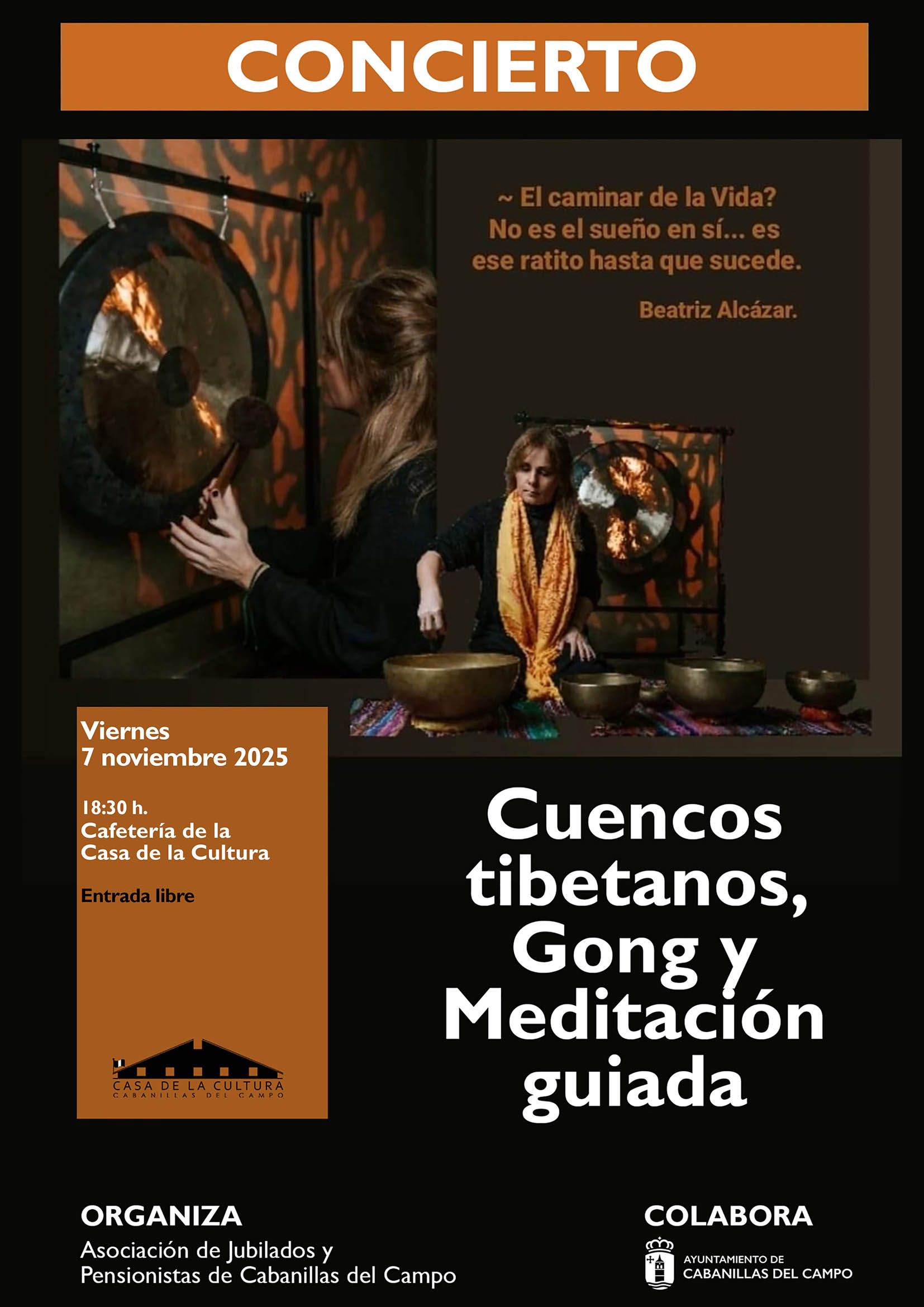 La Asociación de Jubilados y Pensionistas de Cabanillas organiza una vez más un concierto de cuencos tibetanos, gong y meditación guiada. La asociación ya ha organizado casi una decena de estos conciertos en los últimos dos años, siempre con gran éxito.