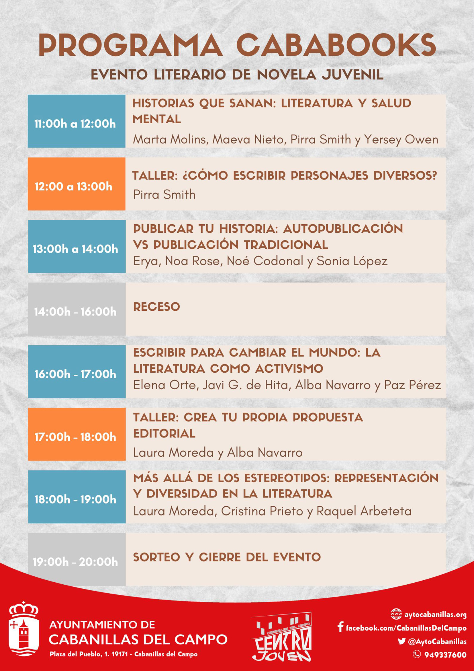 Organizado desde el Programa Municipal de Educación de Calle, Cabanillas del Campo acoge este sábado 11 de octubre de 2025 la primera edición de «CabaBooks», un festival literario juvenil, pensado para todos aquellos chicos y chicas a los que les guste leer y escribir.