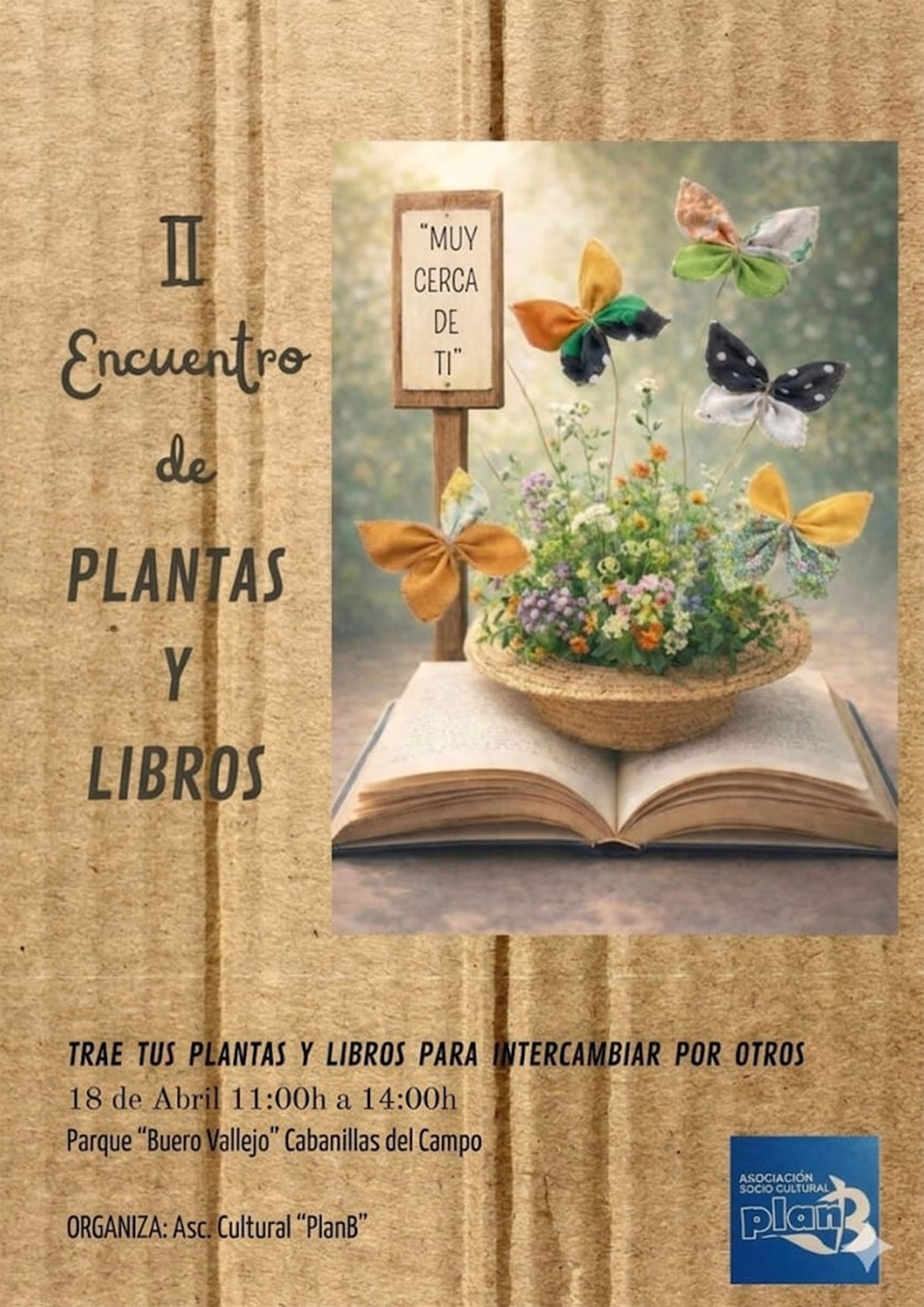 La Asociación Plan B de Cabanillas del Campo organiza la segunda edición de su «Encuentro de Libros y Plantas», que se desarrollará en la mañana del sábado 18 de abril en el Parque Buero Vallejo.