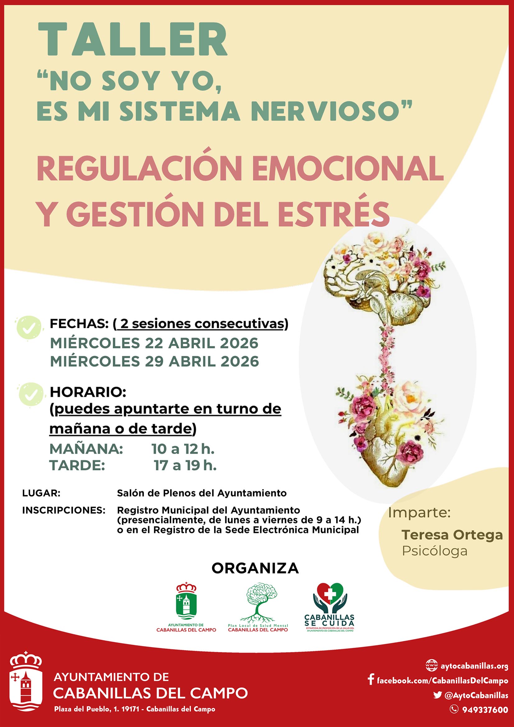 En el marco del Plan Local de Salud Mental y de la estrategia de promoción de la salud pública «Cabanillas se cuida», el Ayuntamiento de Cabanillas del Campo organiza un nuevo taller de salud mental, que se impartirá con dos sesiones, los días 22 y 29 de abril de 2026. Se ofrecen dos horarios (mañana y tarde) a elegir, y se celebrará en el Salón de Plenos del Ayuntamiento. El taller estará impartido por la psicóloga de Cabanillas Teresa Ortega Jareño, y cada sesión tendrá dos horas de duración.