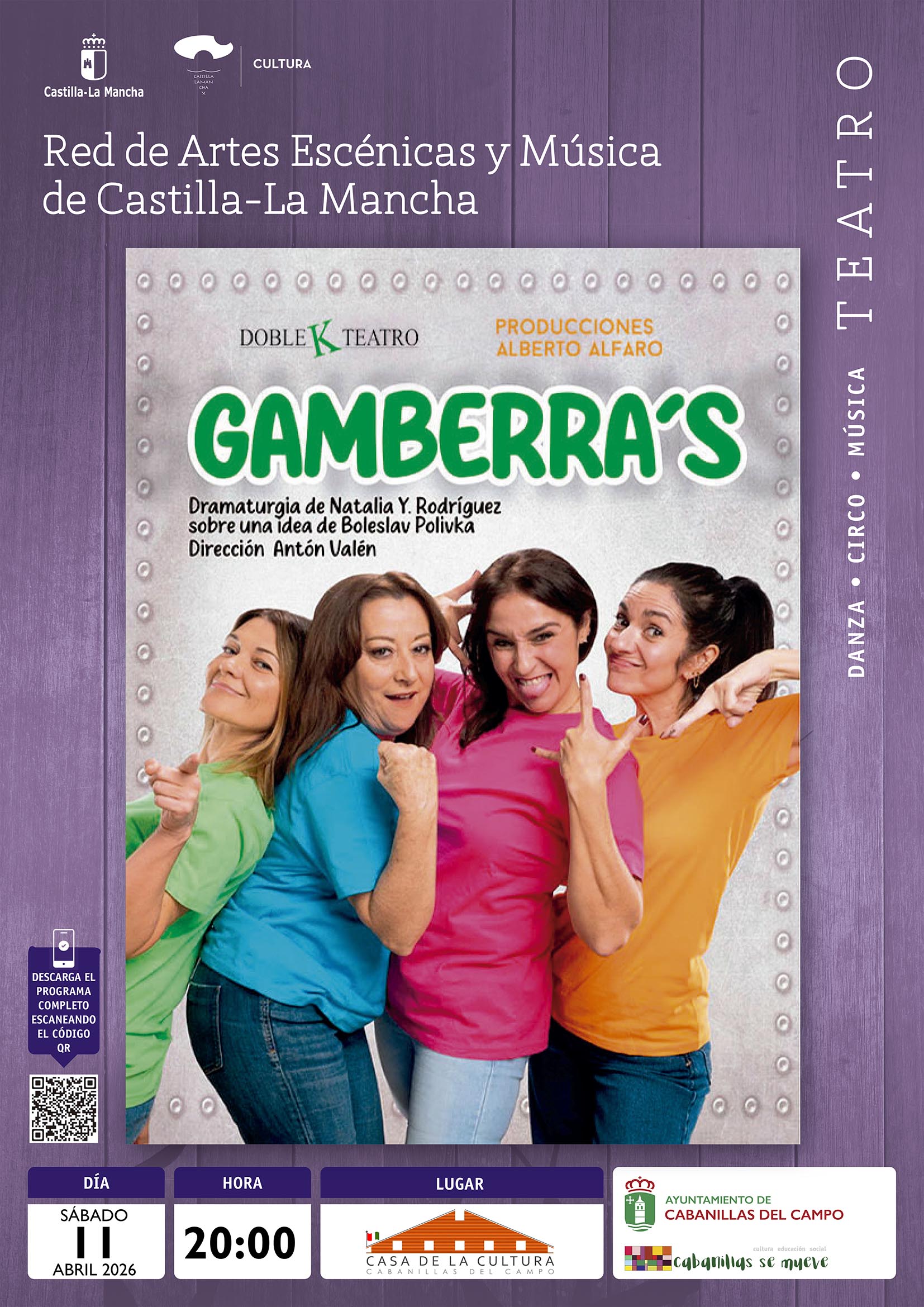 Gamberra’s está inspirada en la obra «I Love Canberra», una creación de 1991 del dramaturgo checo Boleslav Polívka, reconocido por su capacidad para combinar el humor absurdo con una profunda reflexión sobre la condición humana. Con Antón Valén al frente de la dirección, la propuesta está protagonizada por las actrices Eva Torres, Susi Espín, Inma Rufete y Rocío Bernal.