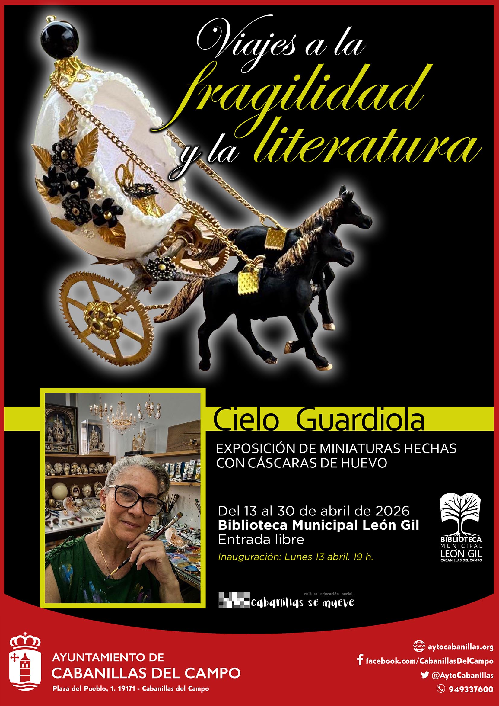 La artesana Cielo Guardiola, vecina de Cabanillas desde hace 20 años, expone una colección de sus creaciones en la Biblioteca Municipal León Gil. Se trata de primorosos objetos en miniatura hechos a partir de cascarones de huevo. En esta exposición, junto a las piezas, habrá cartelas con los fragmentos literarios que inspiraron a la autora en cada creación.