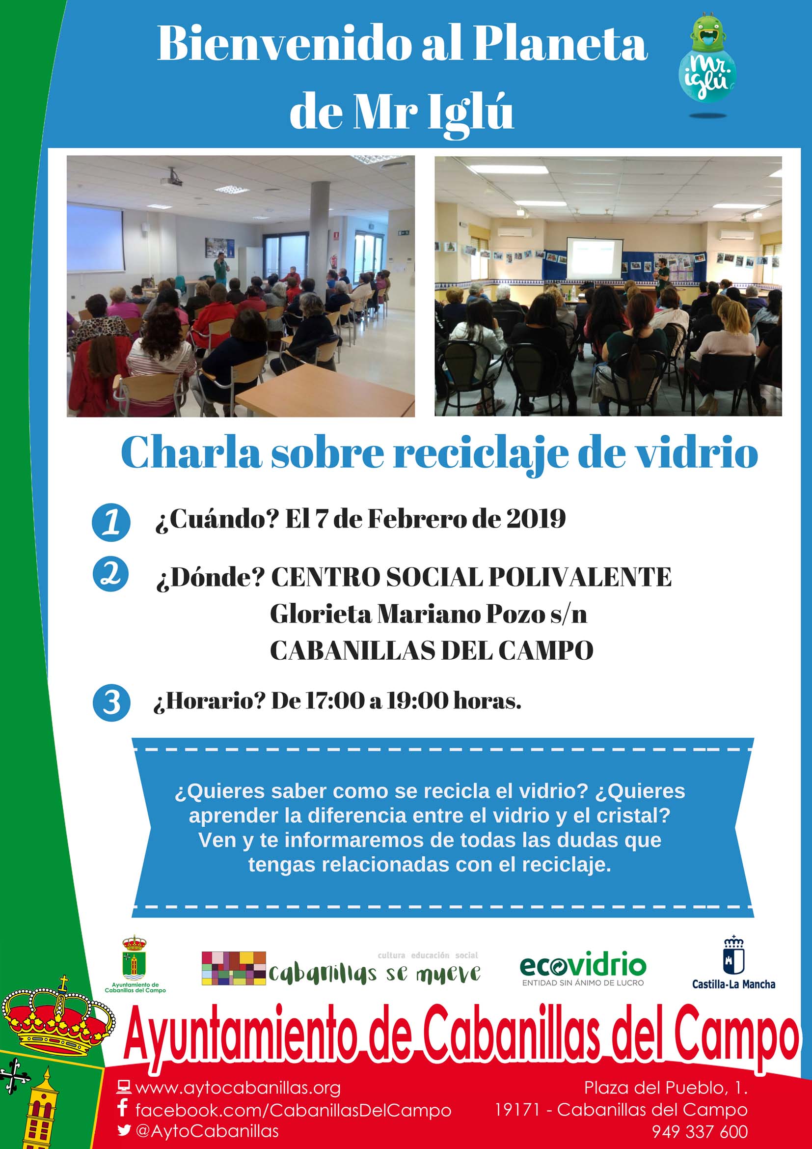 La campaña de sensibilización en el reciclaje de vidrio «Bienvenido al Planeta de Mr. Iglú», que difunde la entidad «Ecovidrio», llegará a Cabanillas del Campo este jueves 7 de febrero, con actos en colegios de la localidad por la mañana, y un acto central para la ciudadanía a celebrar por la tarde. Colaboran en la campaña la Mancomunidad Vega del Henares, la Junta de Comunidades de Castilla-La Mancha y el Ayuntamiento de Cabanillas del Campo.