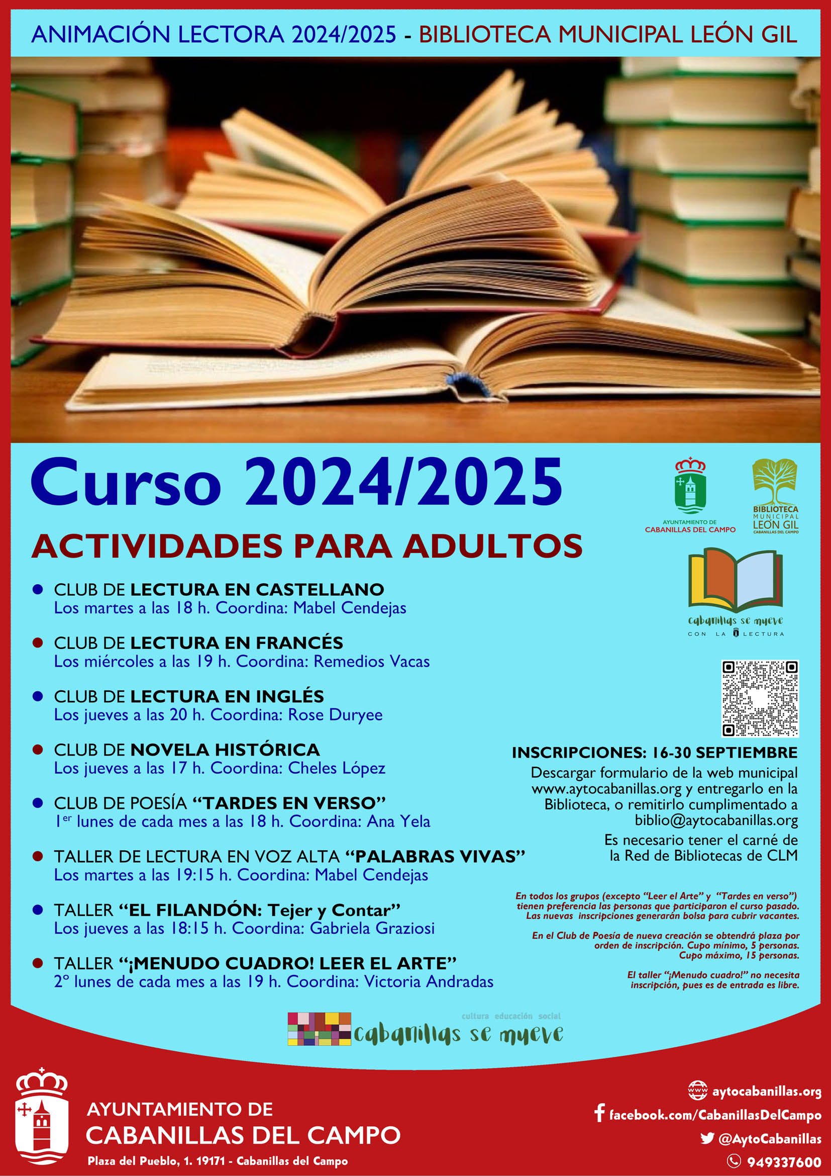 En cuanto a las actividades para público adulto, este año hay que destacar una novedad: la creación del nuevo Club de Poesía «Tardes en Verso», que tendrá periodicidad mensual, y que estará coordinado por la poeta cabanillera Ana Yela. El resto de propuestas para adultos repiten de años anteriores, con los tradicionales tres clubes de lectura en diferentes idiomas (castellano, francés e inglés, y coordinados por Mabel Cendejas, Remedios Vacas y Rose Duryee, respectivamente); el Club de Novela Histórica, que dirige Cheles López; el taller de lectura en voz alta «Palabras Vivas», que dirige Mabel Cendejas; el taller «El Filandón» (que combina narración y ganchillo, y coordina Gabriela Graziosi); y por segundo año consecutivo también se ofrecerá el taller «¡Menudo cuadro! Leer el arte», con charlas mensuales sobre grandes obras de la pintura a cargo de Vito Andradas. Esta última es la única de todas las propuestas que no requiere inscripción, ya que se desarrolla con sesiones de entrada libre.