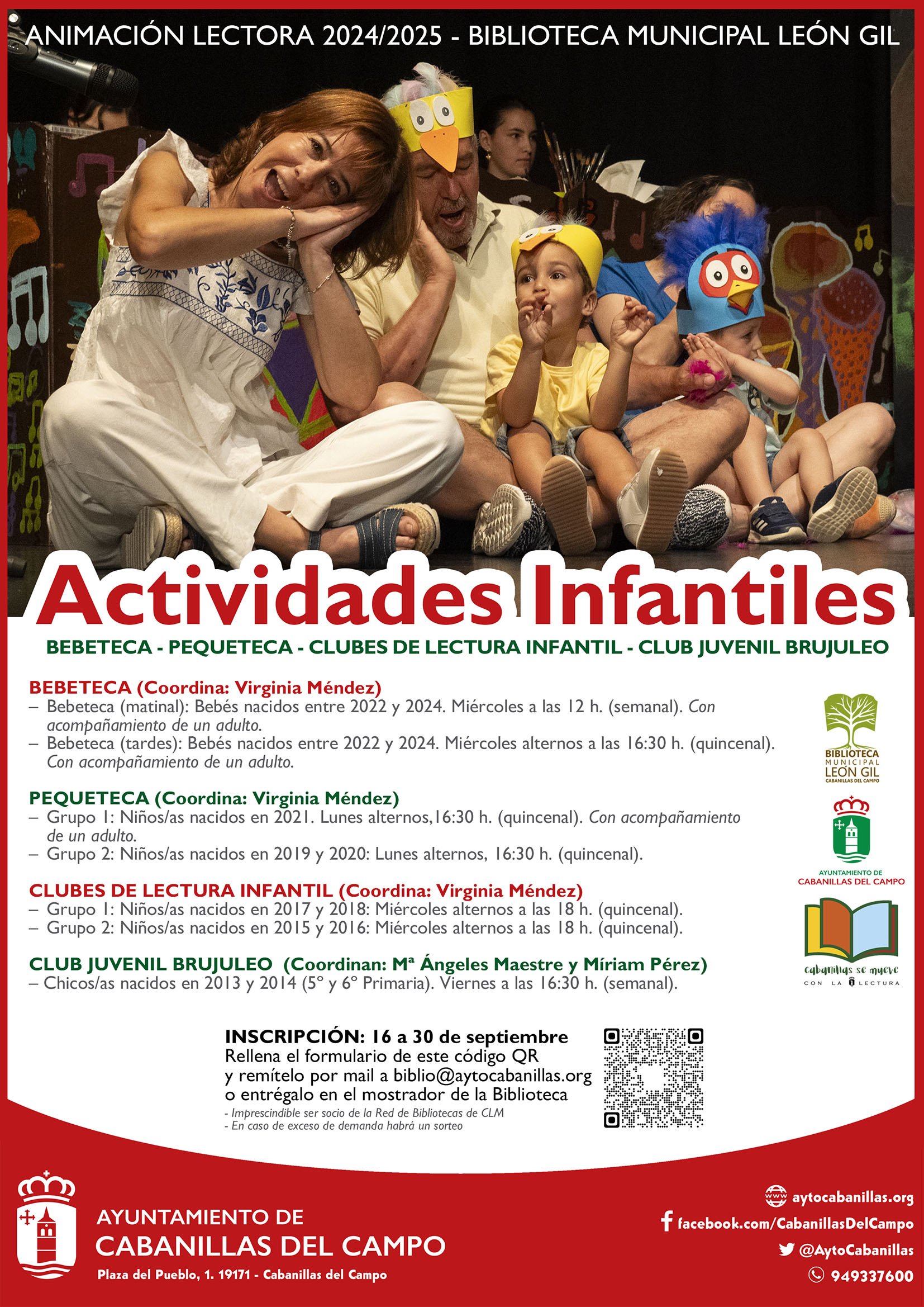 Las actividades infantiles repiten respecto al curso anterior, y se estructuran en función de la edad de los participantes: «Bebeteca» (para bebés nacidos entre 2022 y 2024), «Pequeteca» (para niños y niñas nacidos entre 2019 y 2021), dos Clubes de Lectura Infantil (para niños y niñas nacidos entre 2015 y 2018), y un Club de Lectura Juvenil, el «Brujuleo», para chicos y chicas adolescentes de 5º y 6º de Primaria, nacidos entre 2013 y 2014. Todas las actividades infantiles estarán dirigidas por la animadora cabanillera Virginia Méndez, a excepción del «Brujuleo», que lo coordinarán las narradoras de la localidad Ángeles Maestre y Míriam Pérez.