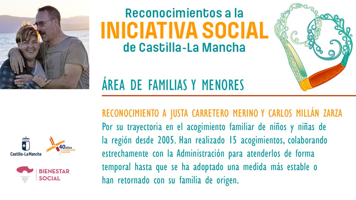 El Diario Oficial de Castilla-La Mancha del pasado jueves 8 de noviembre recoge una resolución, firmada por la consejera de Bienestar Social de la Junta de Comunidades de Castilla-La Mancha, Aurelia Sanchez Navarro, por el que se concede el «Reconocimiento a la Iniciativa Social de Castilla-La Mancha», en el área de «Familia y Menores», a los vecinos de Cabanillas Justi Carretero Merino y Carlos Millán Zarza.