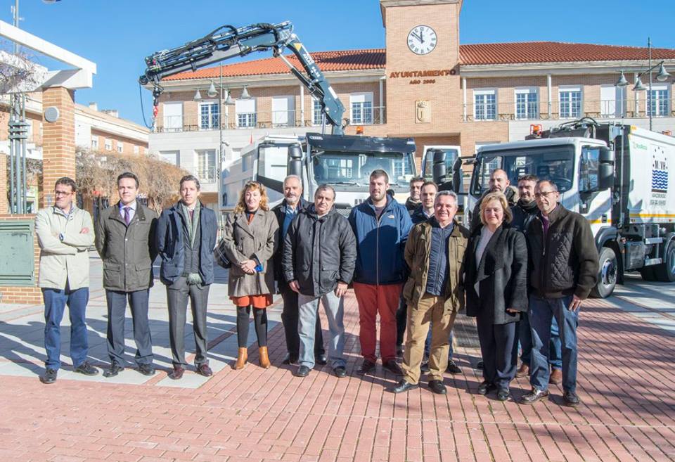 El presidente de la Mancomunidad Vega del Henares, Santiago Casas, acompañado de varios alcaldes de municipios miembros, ha presentado este jueves la nueva flota de camiones para la recogida de residuos urbanos que va a comenzar a dar servicio a todas las localidades que forman parte de la entidad. Se trata de 7 nuevos vehículos adquiridos en virtud del acuerdo suscrito en 2017 para la prórroga del contrato de